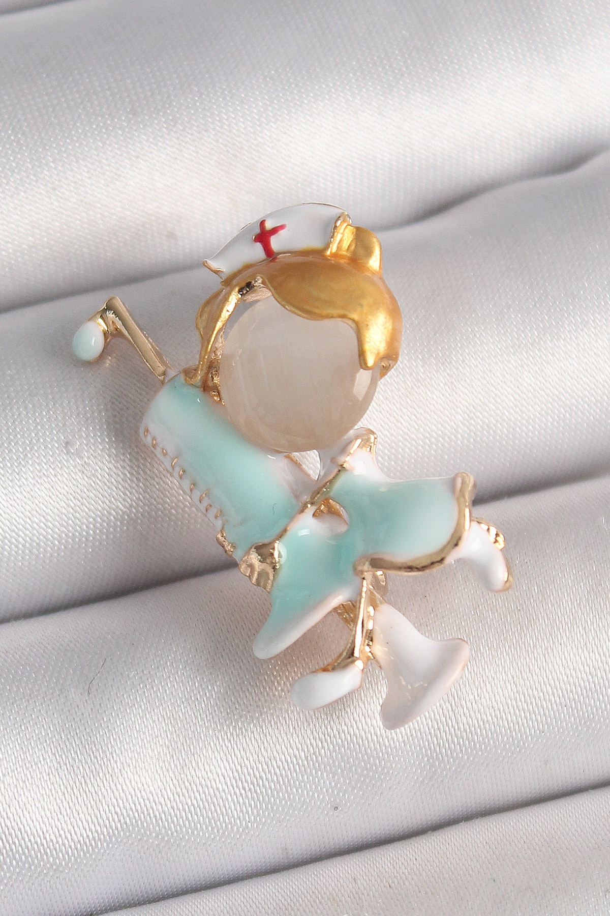 Pirinç Gold Renk Beyaz Mavi Renk Hemşire Model Şırınga Detay Kadın Broş - TJ-BR424