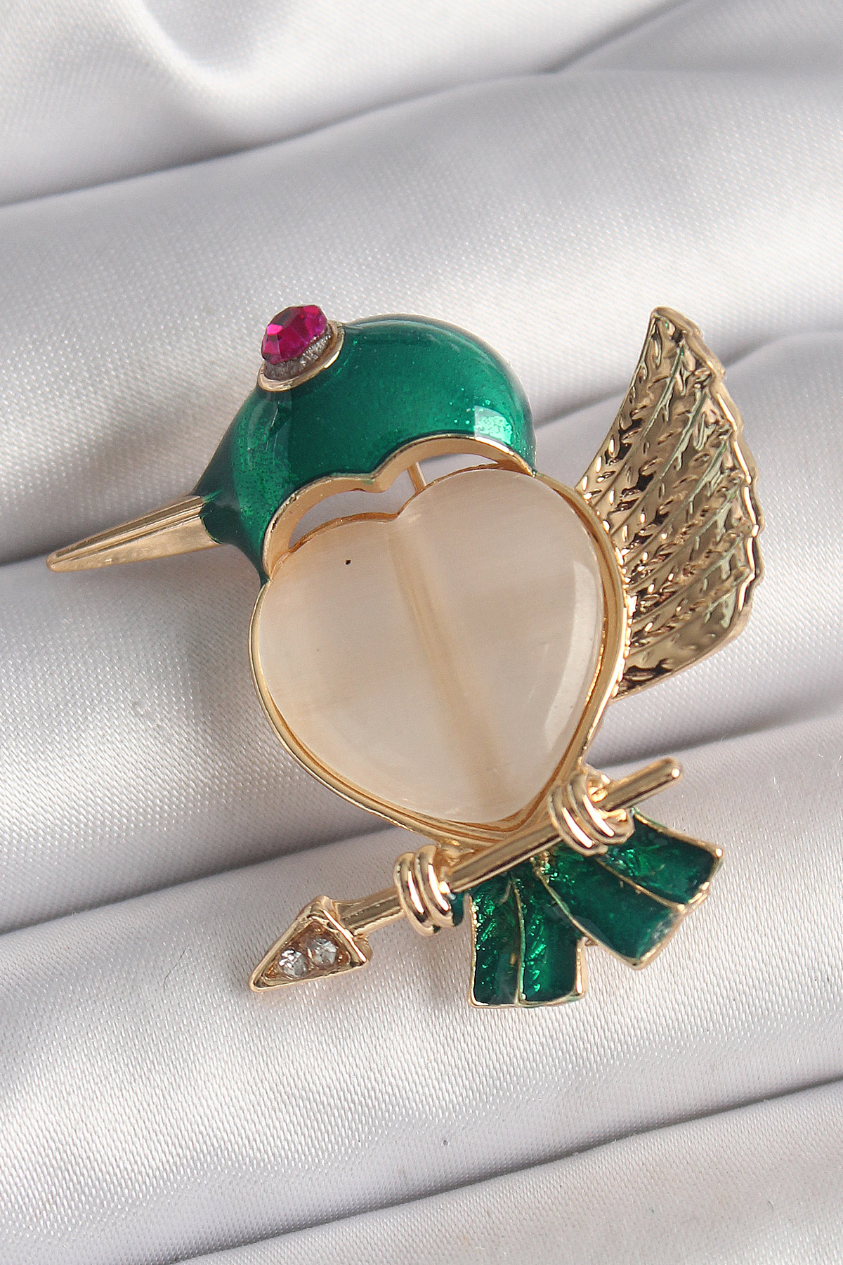 Pirinç Gold Renk Beyaz Mineli Kalp Yeşil Sinek Kuşu Model Pembe Zirkon Taş Detay Kadın Broş - TJ-BR419