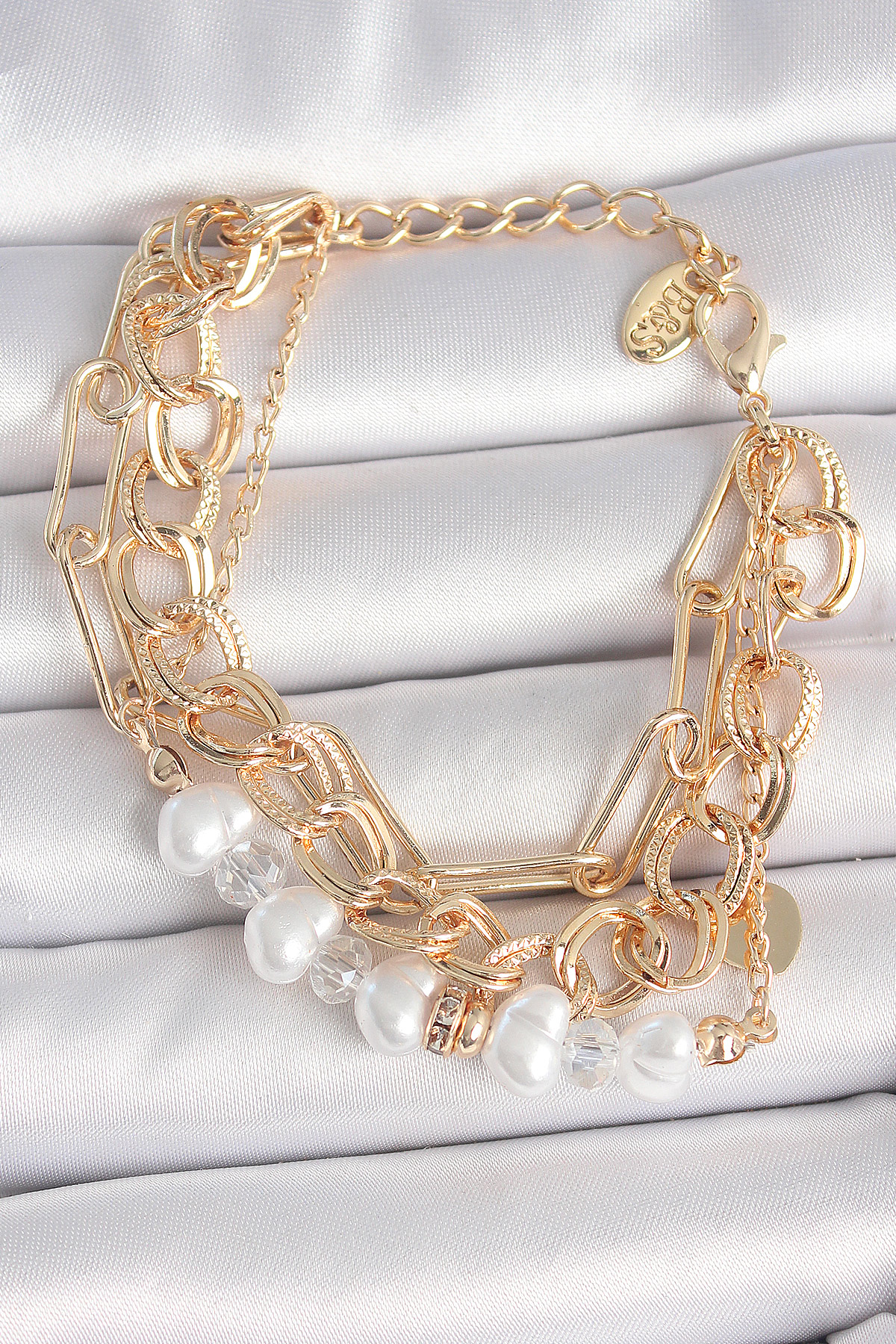 Pirinç Gold Renk Çoklu Zincir Model İncilli Zirkon Taş Detay Kadın Bileklik - TJ-BB6960