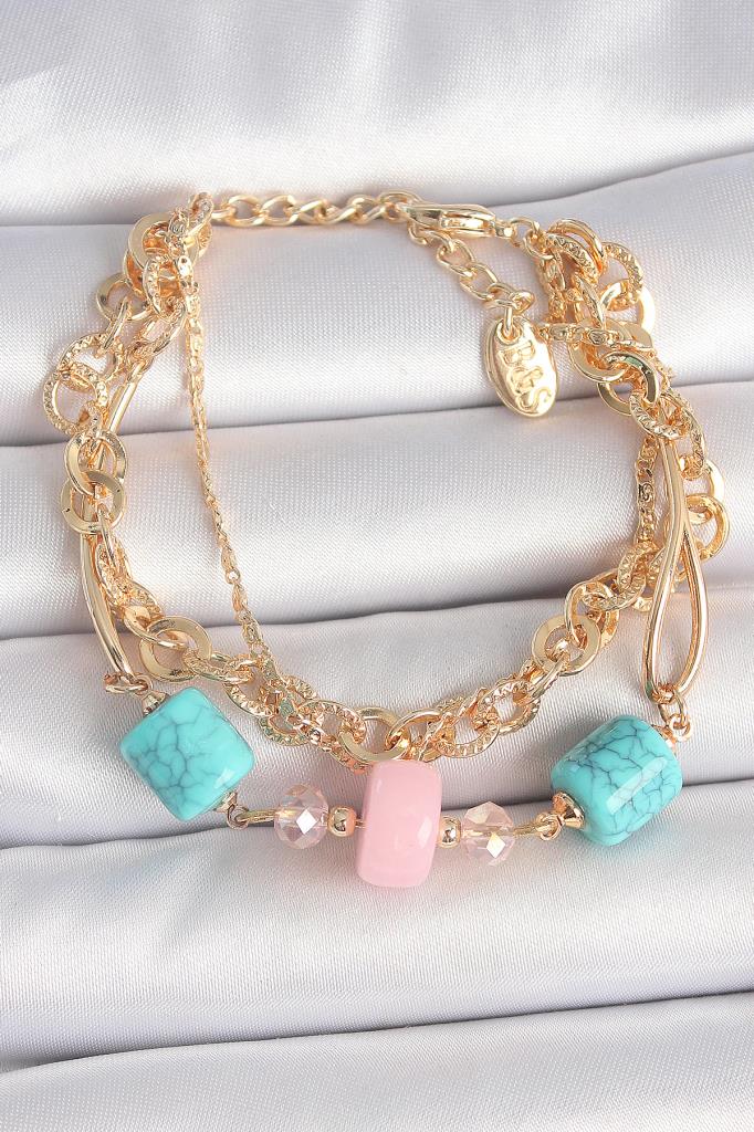Pirinç Gold Renk Çoklu Zincir Model Mavi Taş Figürlü Kadın Bileklik - BB6959