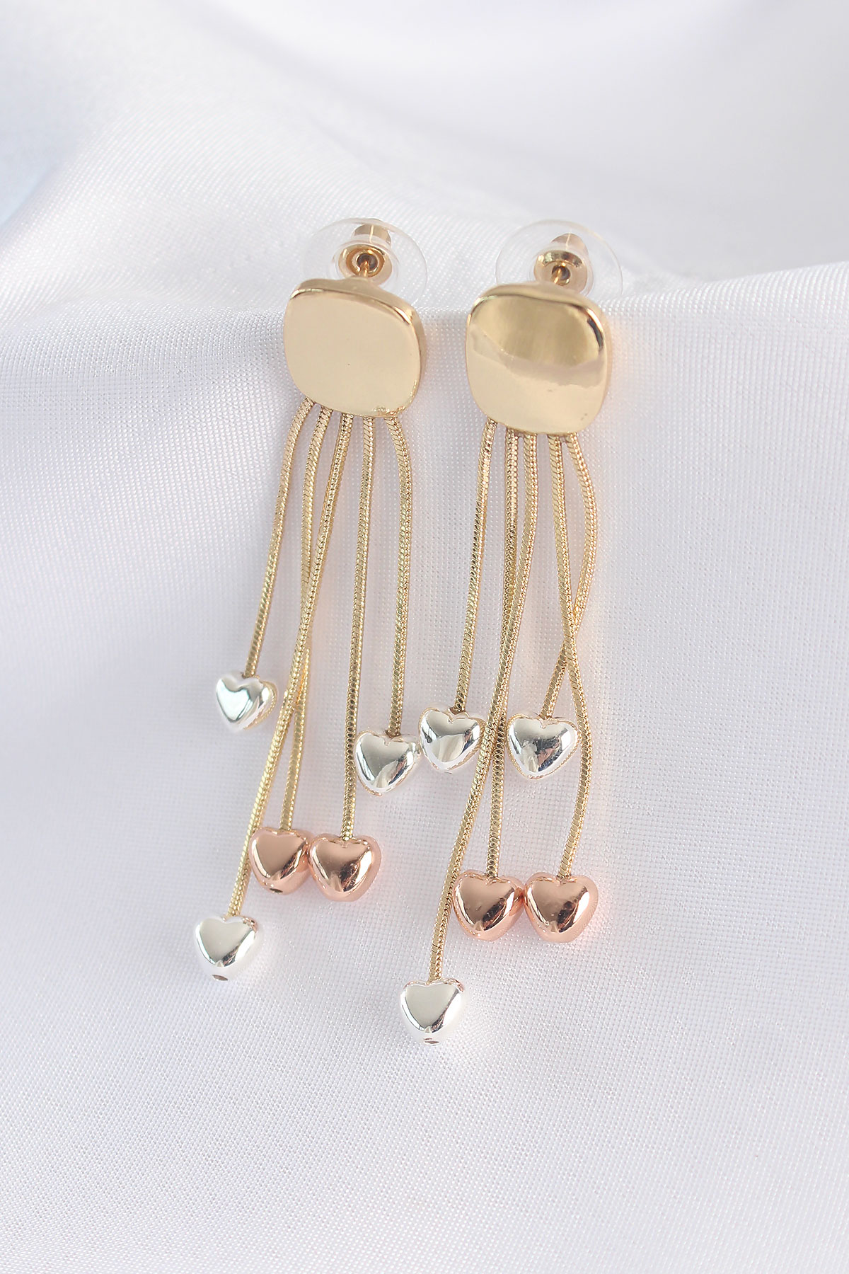 Pirinç Gold Renk Düz Plaka Renkli Kalp Detay Küpe - TJ-BKP8911