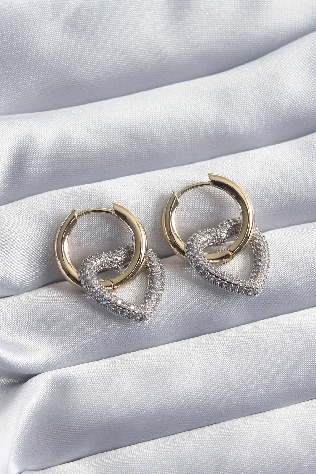 Pirinç Gold Renk Halka Gümüş Zirkon Taşlı Kalp Model VİP Seri Kadın Küpe - TJ-BKP8229