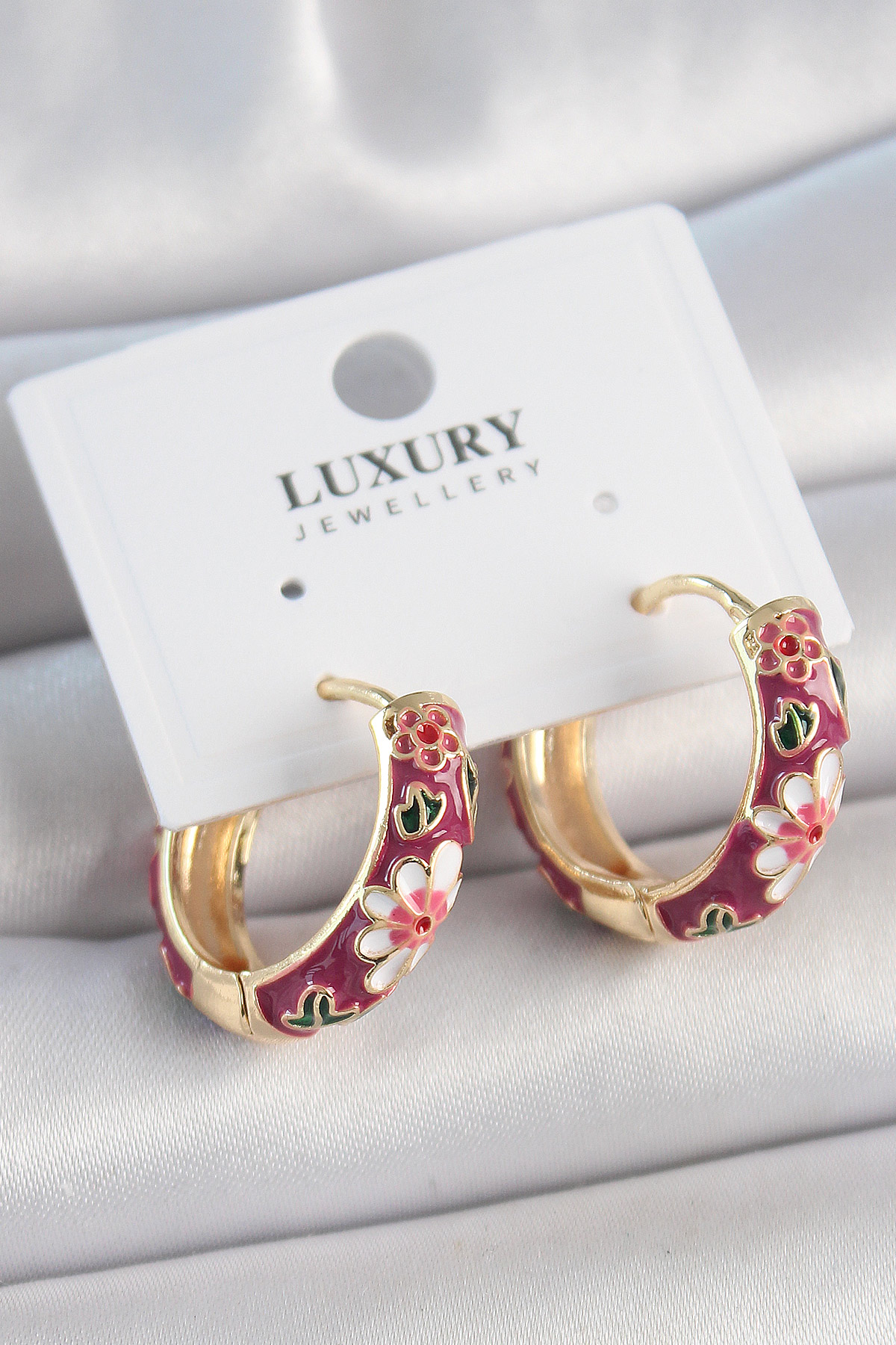 Pirinç Gold Renk Halka Mor Çiçek Mineli Kadın Küpe - TJ-BKP10474