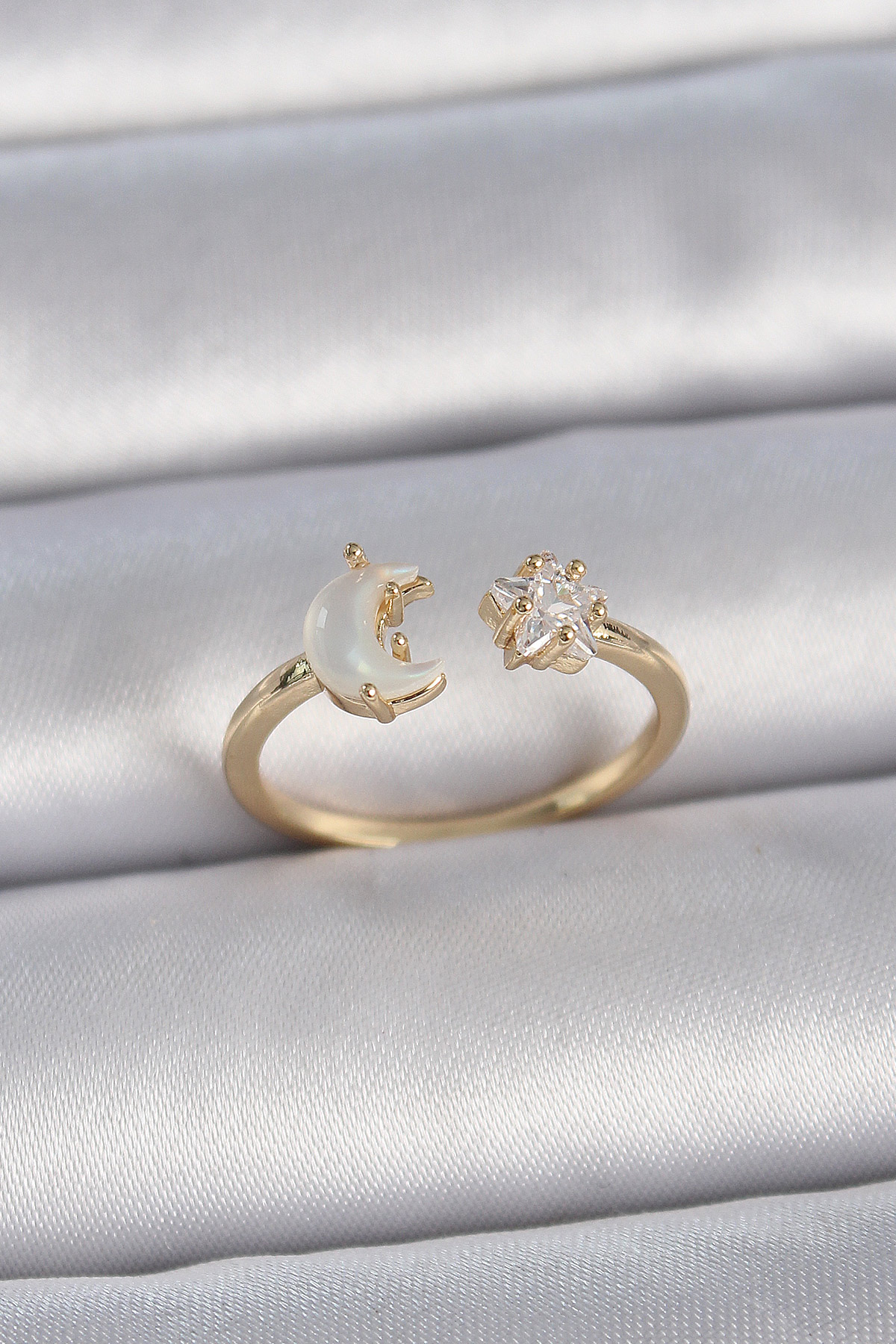 Pirinç Gold Renk İncili Hilal Zirkon Taşlı Yıldız Ayarlanabilir Model Kadın Yüzük - TJ-BYK3360