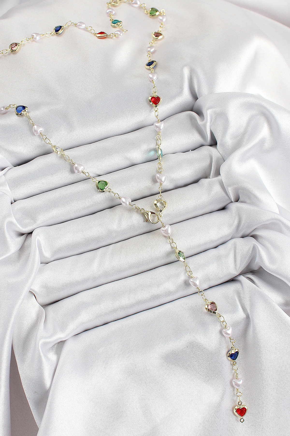 Pirinç Gold Renk İncili Zirkon Taşlı Kalpli Y Kadın Kolye - TJ-BKO10299