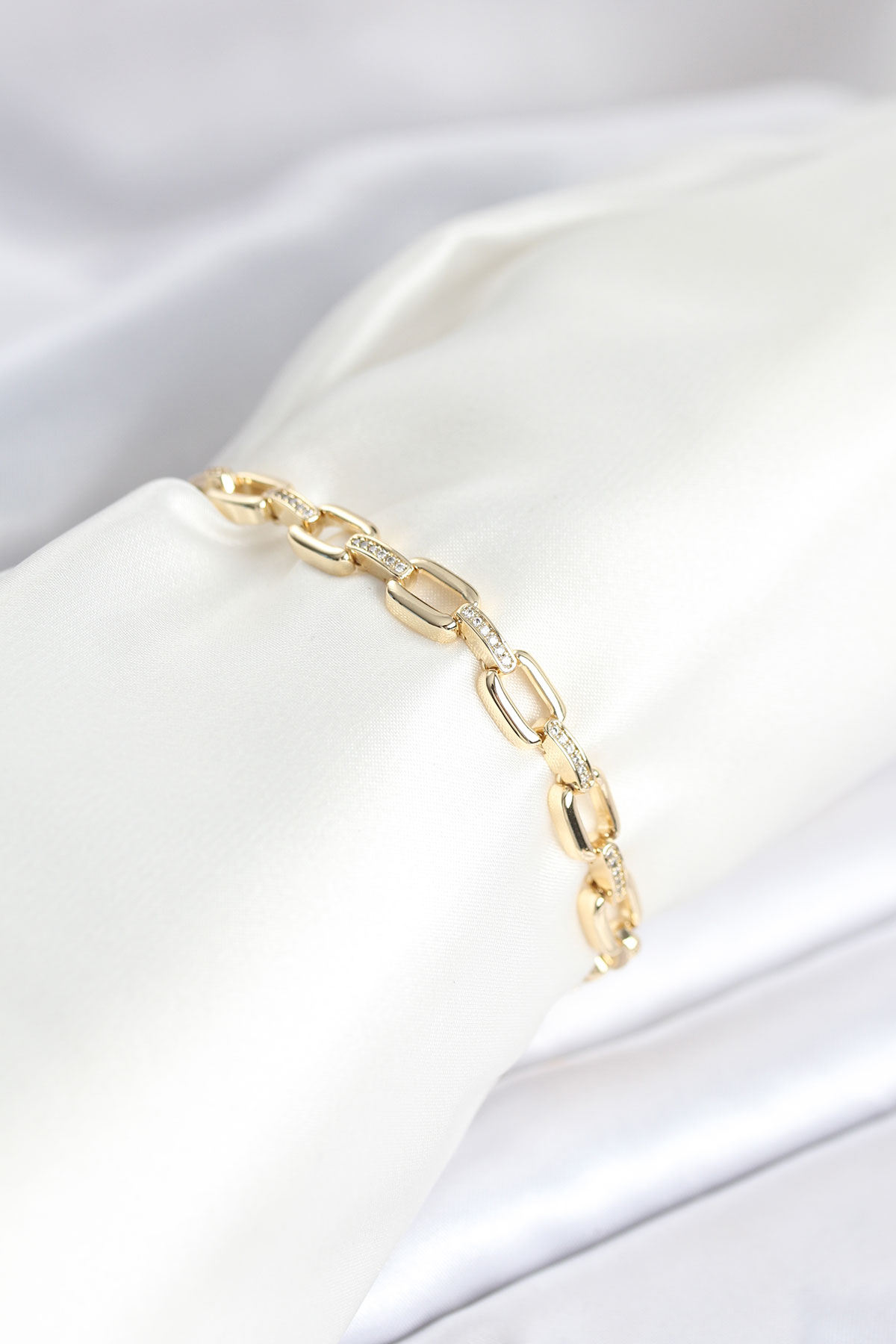 Pirinç Gold Renk Kare Zincir Model Zirkon Taşlı Kadın Bileklik - TJ-BB8030
