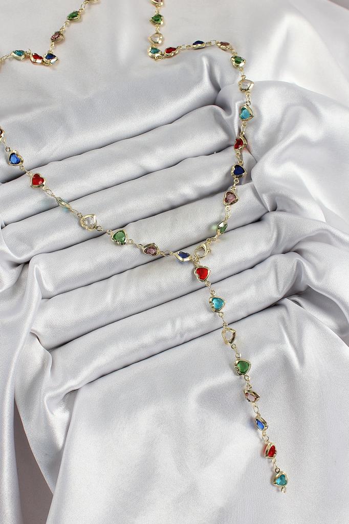 Pirinç Gold Renk Karışık Renk Zirkon Taşlı Kalpli Y Kadın Kolye - BKO10303