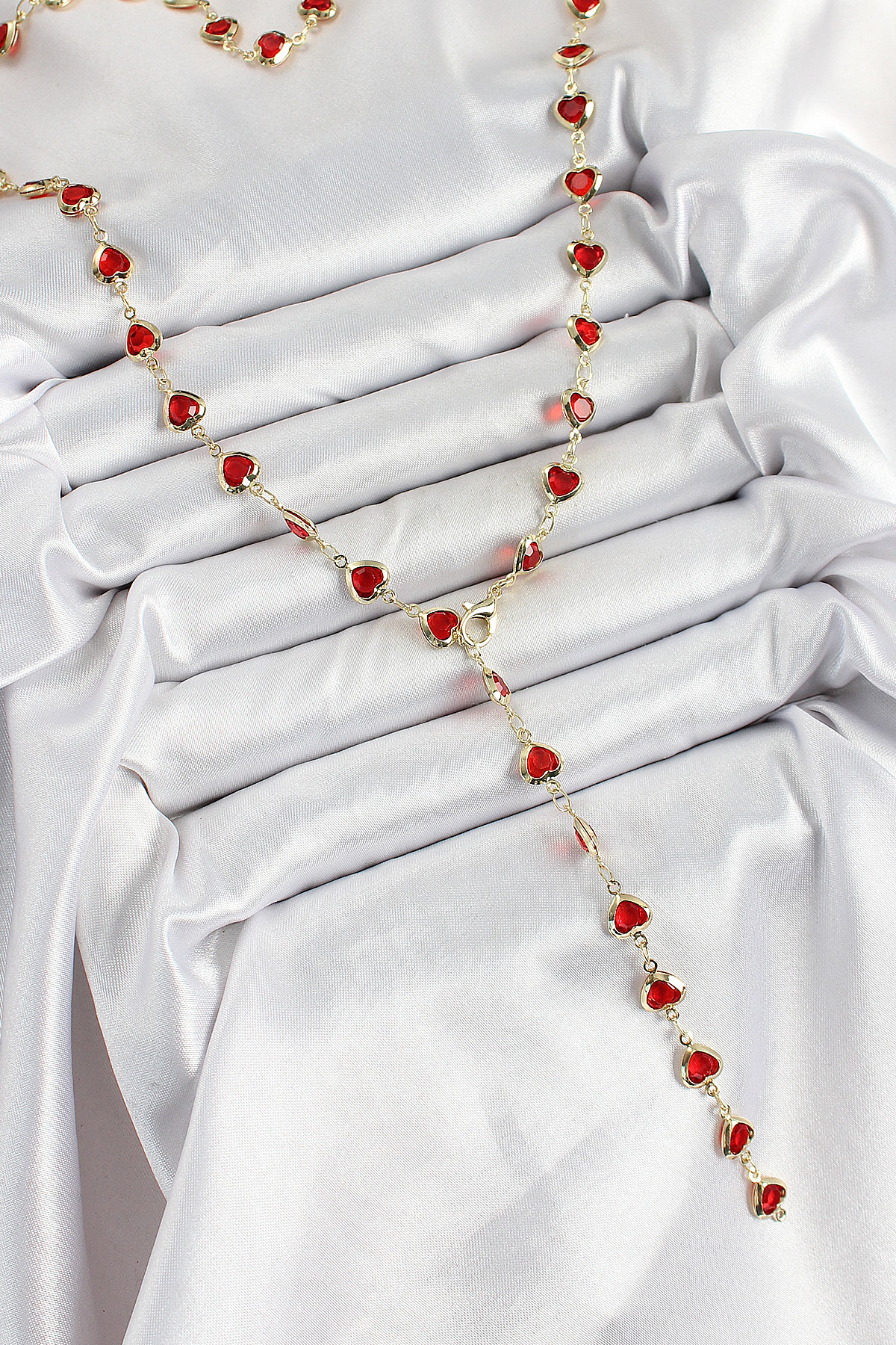 Pirinç Gold Renk Kırmızı Zirkon Taşlı Kalpli Y Kadın Kolye - TJ-BKO10297