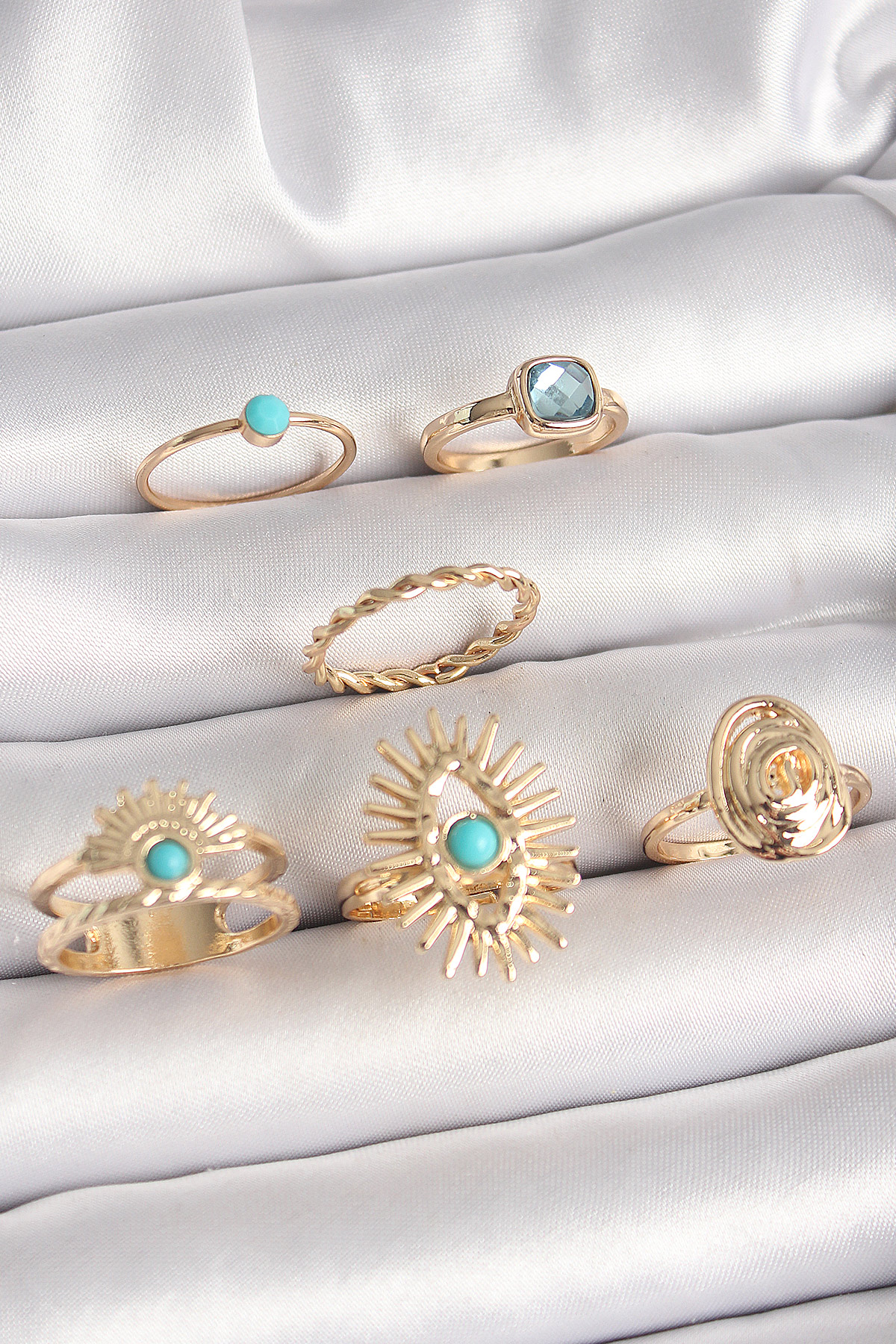 Pirinç Gold Renk Mavi Taşlı Göz Model Kare Zirkon Taşlı Kadın Yüzük Kombini - TJ-BYK3670