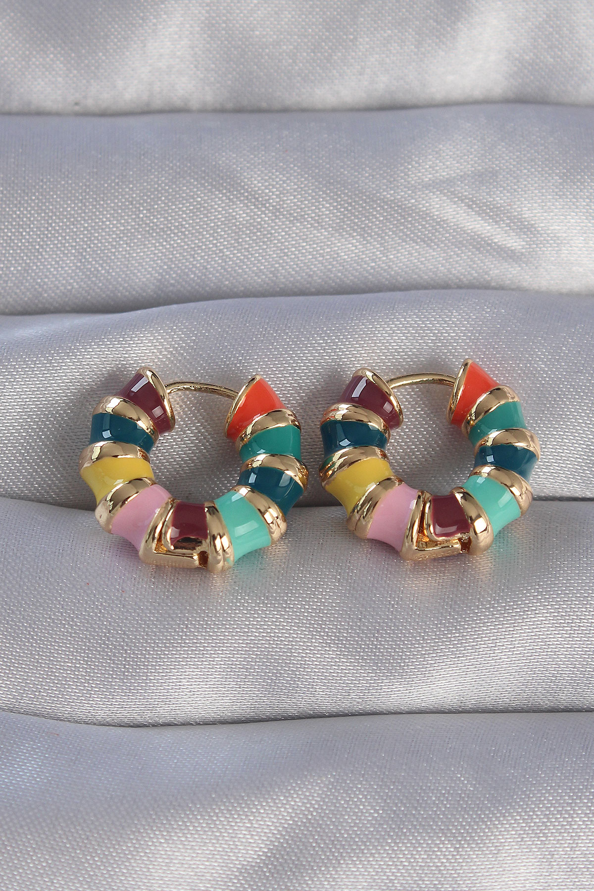 Pirinç Gold Renk Mineli Çok Renkli Kabartmalı Halka Küpe - TJ-BKP9077
