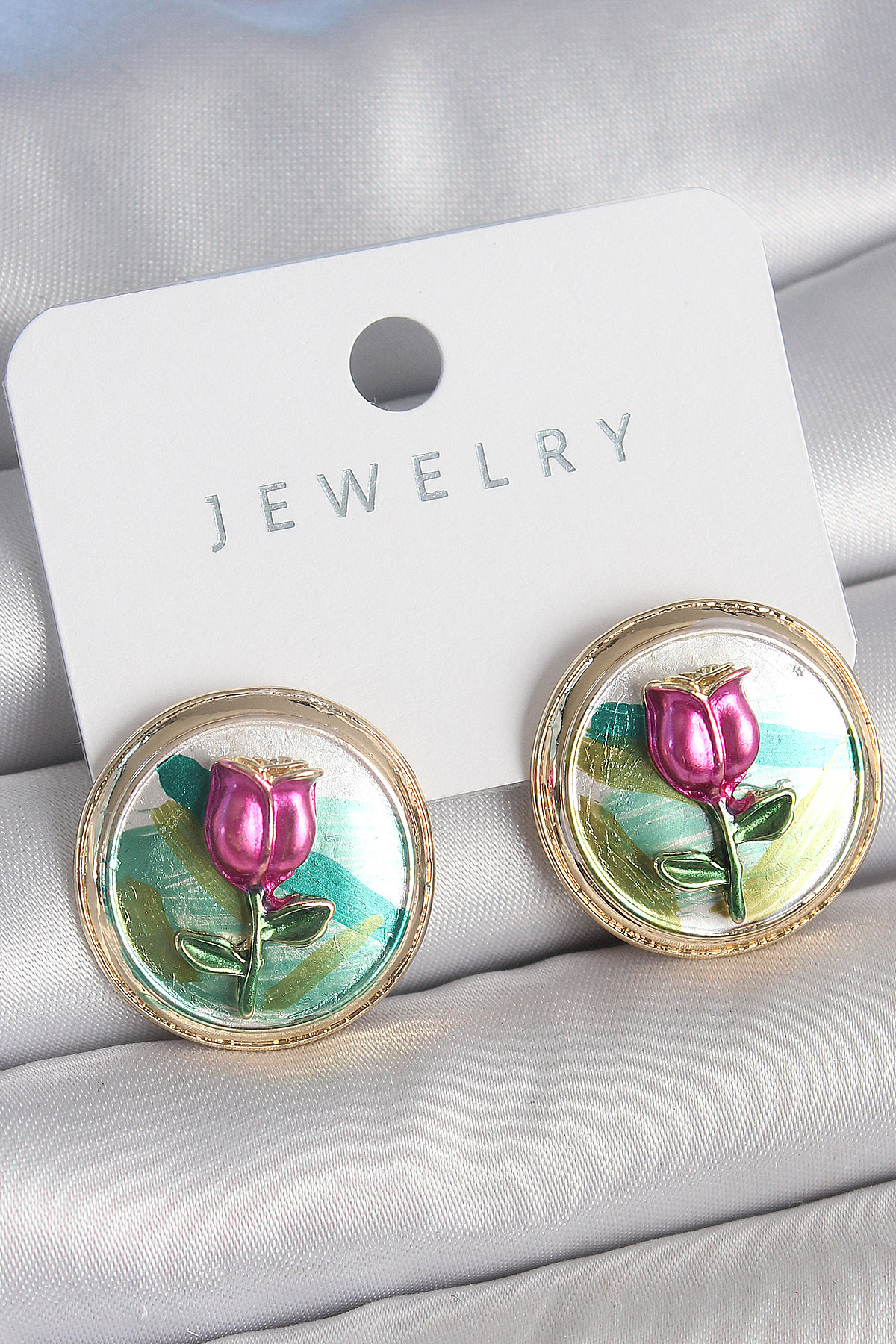 Pirinç Gold Renk Mix Renk Mineli Çiçek İşlemeli Portre Model Kadın Küpe - TJ-BKP10504