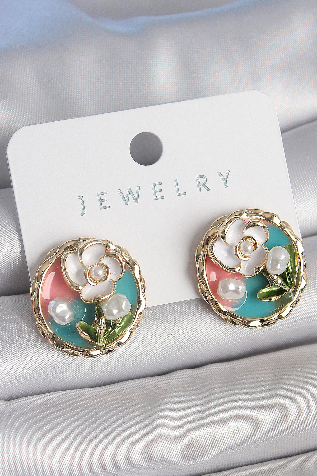 Pirinç Gold Renk Mix Renk Mineli İncili Çiçek İşlemeli Portre Model Kadın Küpe - TJ-BKP10502
