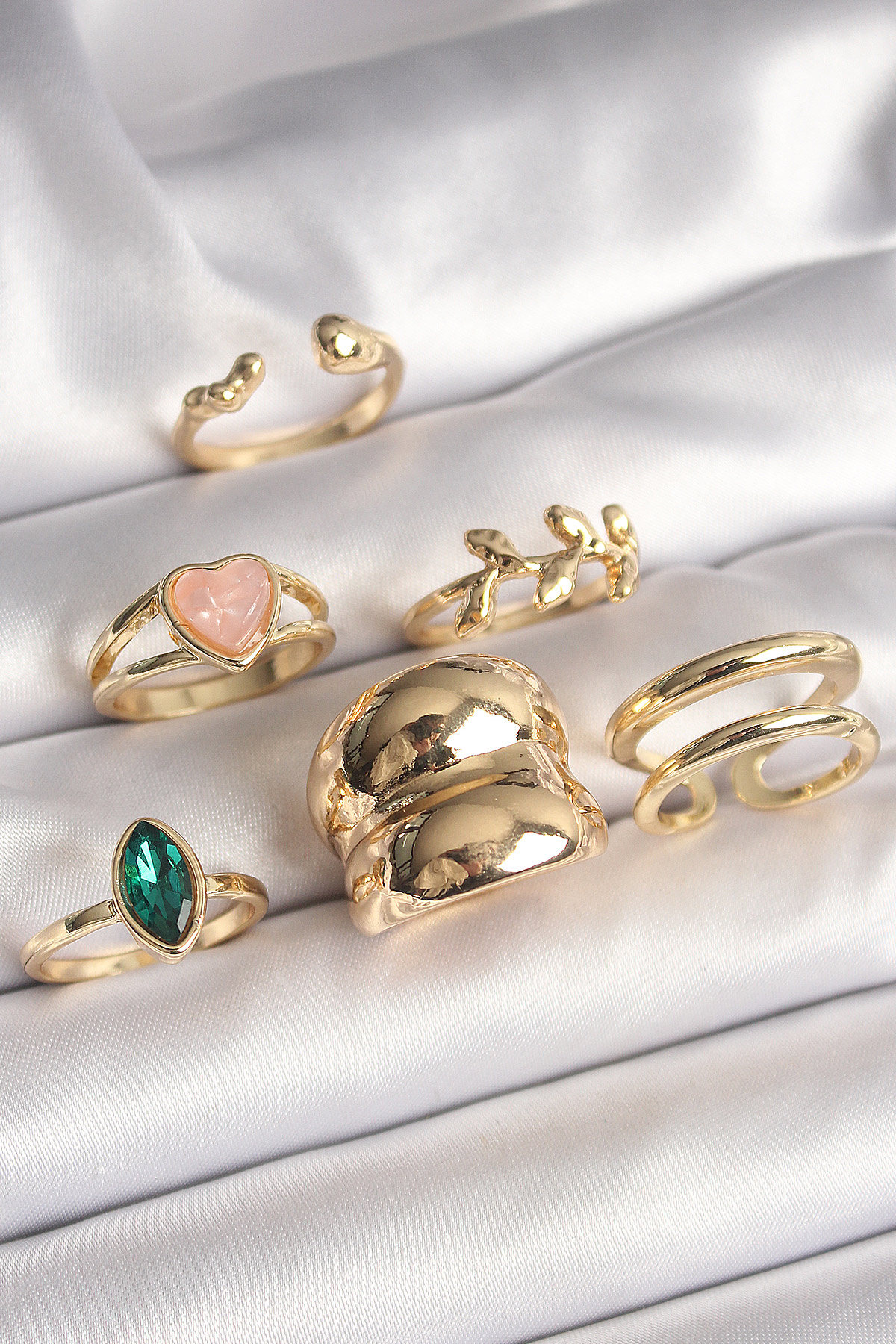Pirinç Gold Renk Pembe Mineli Kalp Figür Yeşil Zirkon Taşlı 6'Lı Kadın Küpe Seti - TJ-BYK3636