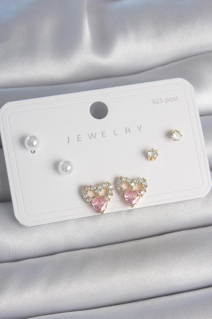 Pirinç Gold Renk Pembe Zirkon Taşlı Kalp Model İnci Detay 925 Ayar Kadın Küpe Seti - BKP10488