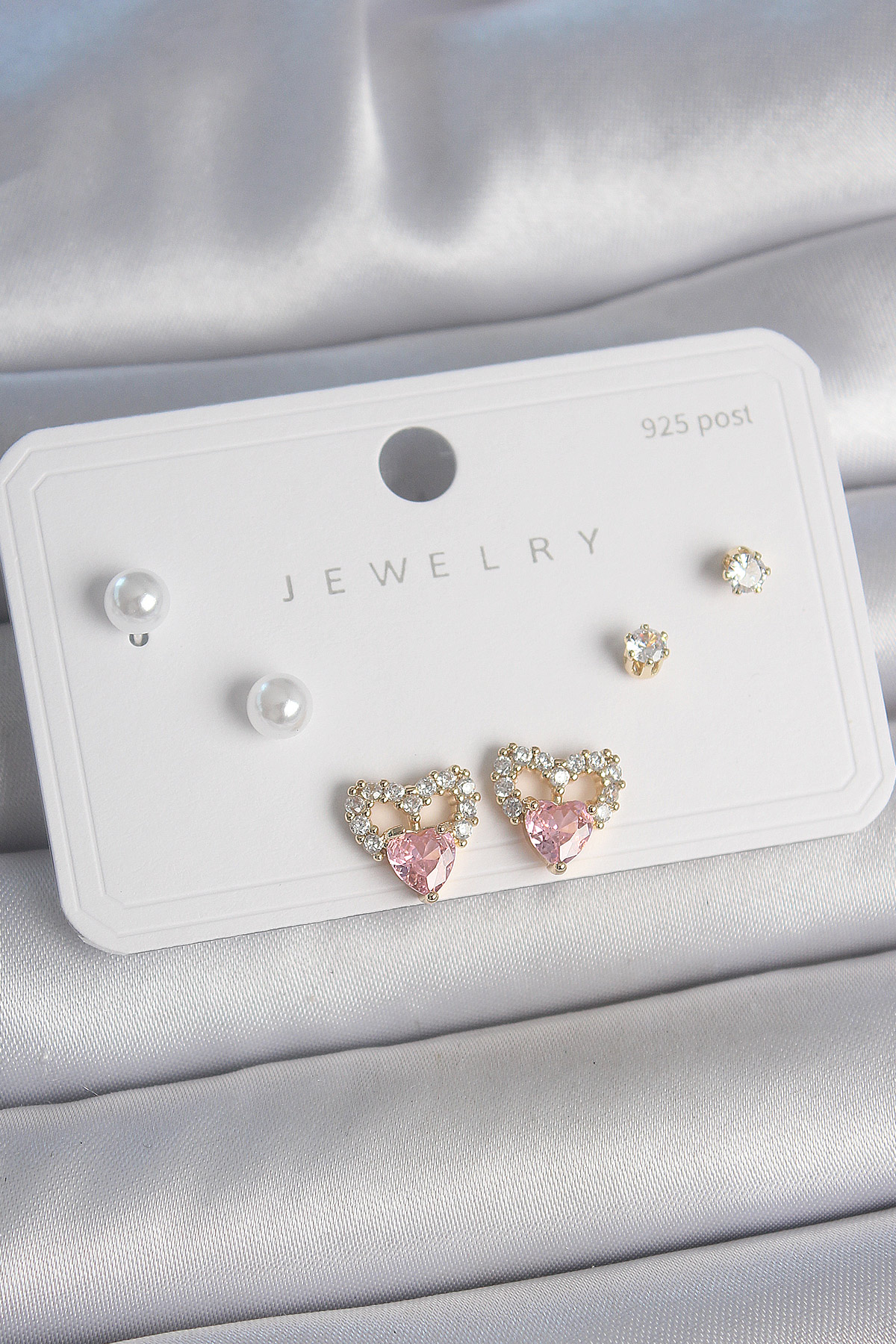Pirinç Gold Renk Pembe Zirkon Taşlı Kalp Model İnci Detay 925 Ayar Kadın Küpe Seti - TJ-BKP10488