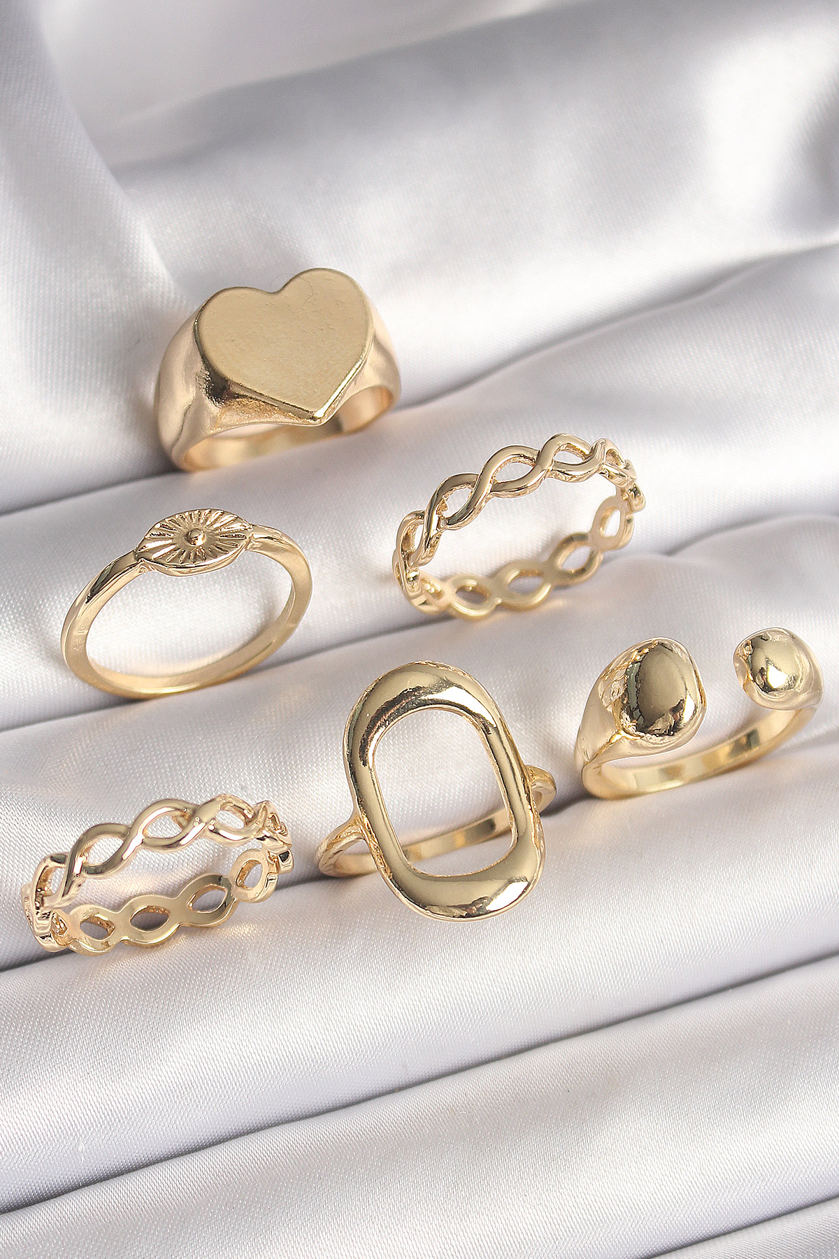 Pirinç Gold Renk Plaka Kalp Model Göz İşleme Detayı 6'Lı Kadın Yüzük Seti - TJ-BYK3635