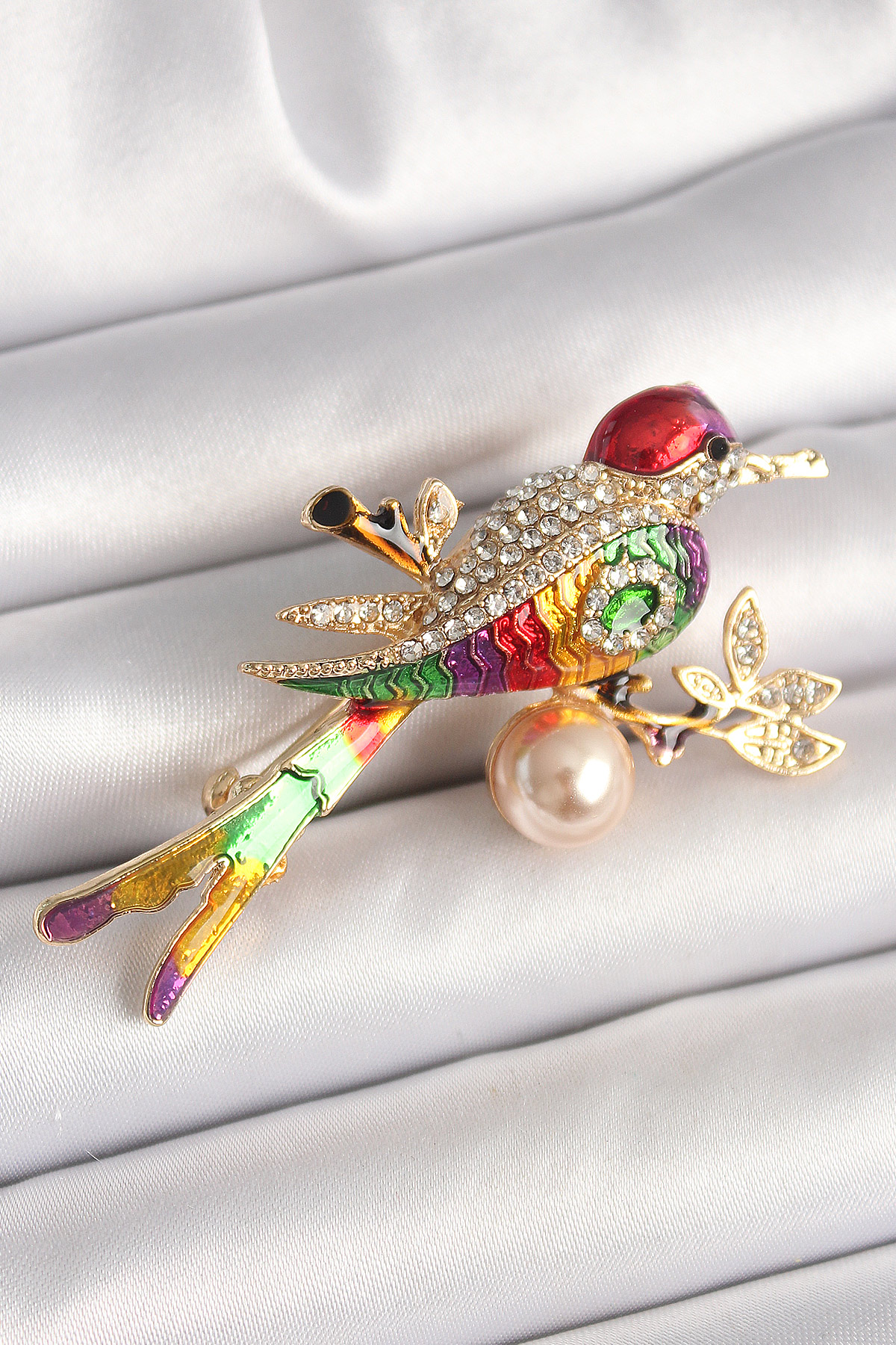 Pirinç Gold Renk Renkli Kuş Model Zirkon Taş Detay Kadın Broş - TJ-BR430