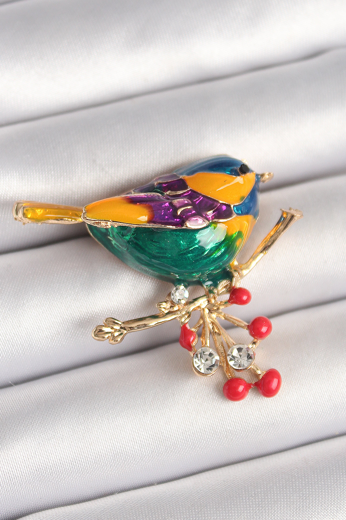 Pirinç Gold Renk Renkli Kuş Model Zirkon Taş Detay Kadın Broş - TJ-BR434