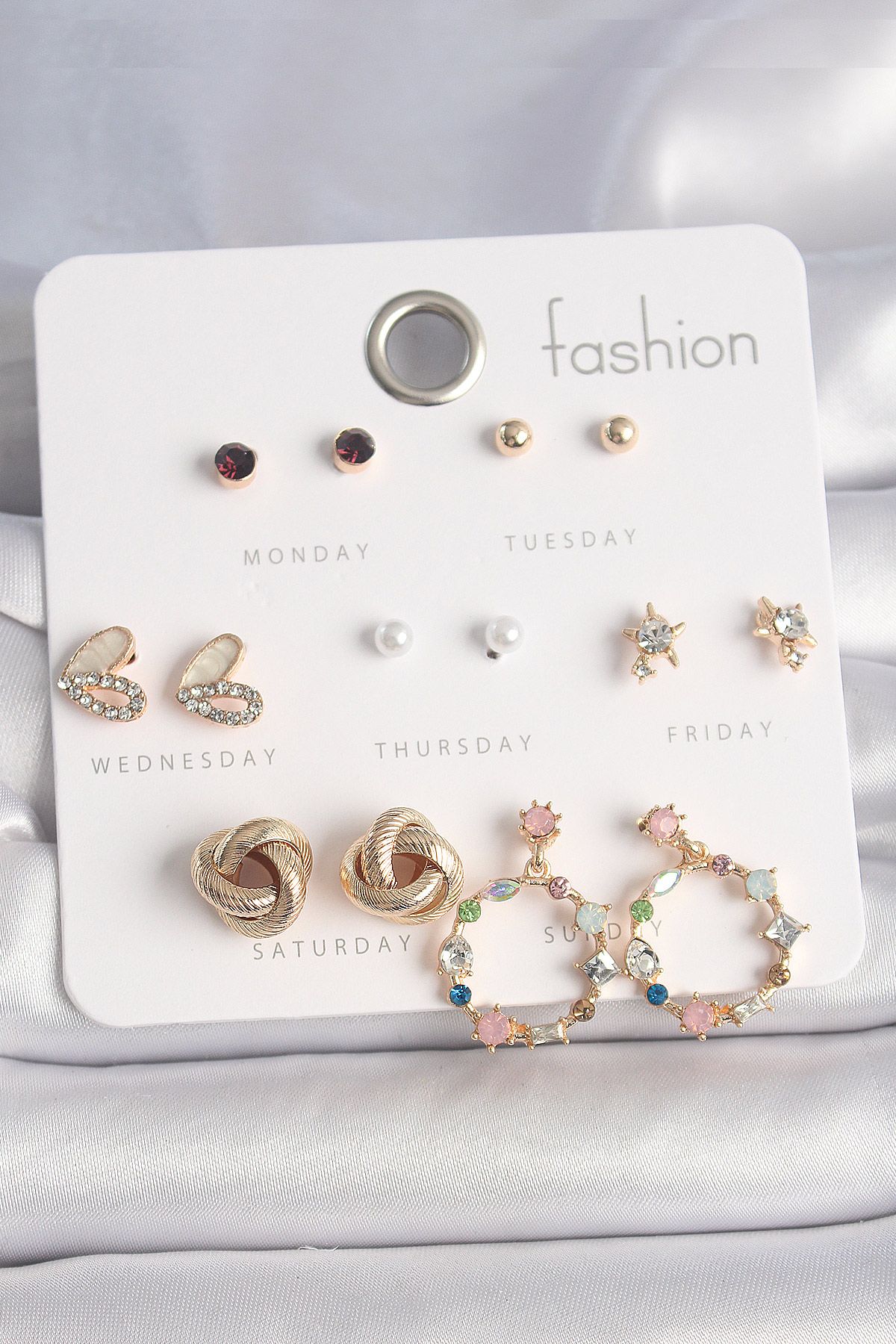 Pirinç Gold Renk Renkli Zirkon Taşlı Kalp Detay 7 Çift Kadın Küpe Seti - TJ-BKP10162