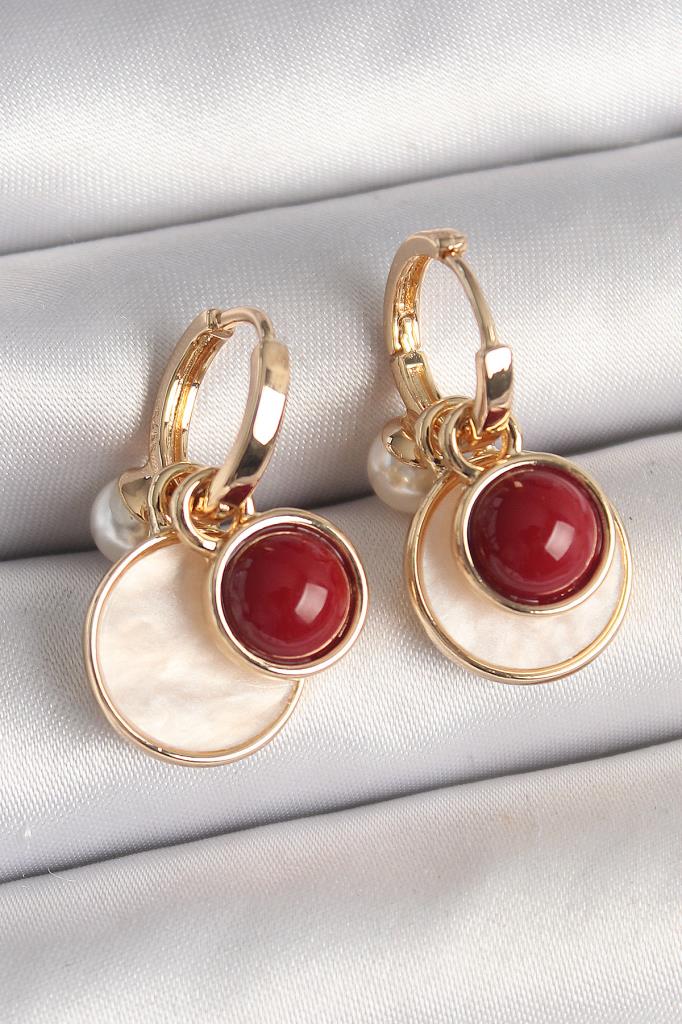 Pirinç Gold Renk Sallantı Beyaz Mineli Bordo Detay Kadın Küpe - BKP10362