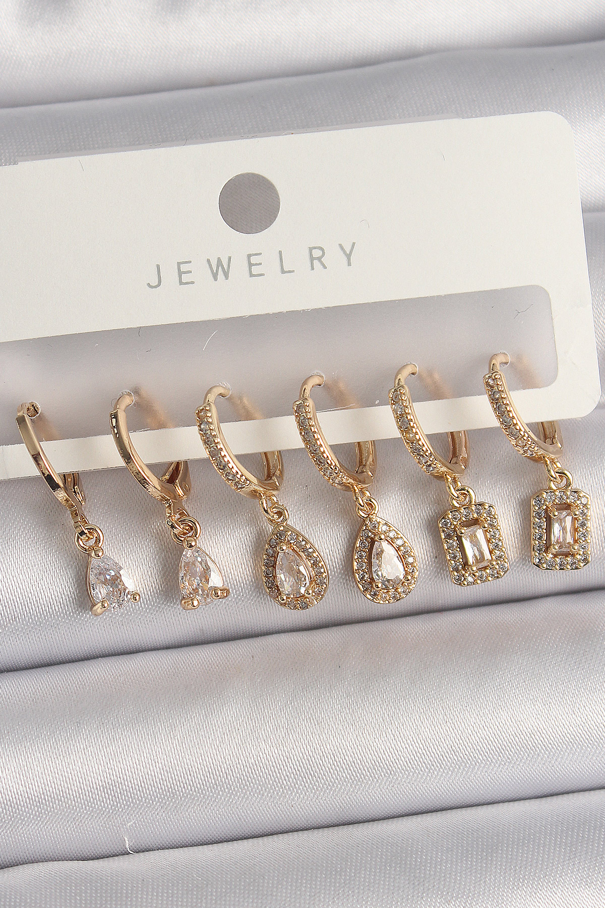 Pirinç Gold Renk Sallantı Zirkon Taşı Damla Model Kadın Küpe Seti - TJ-BKP10120