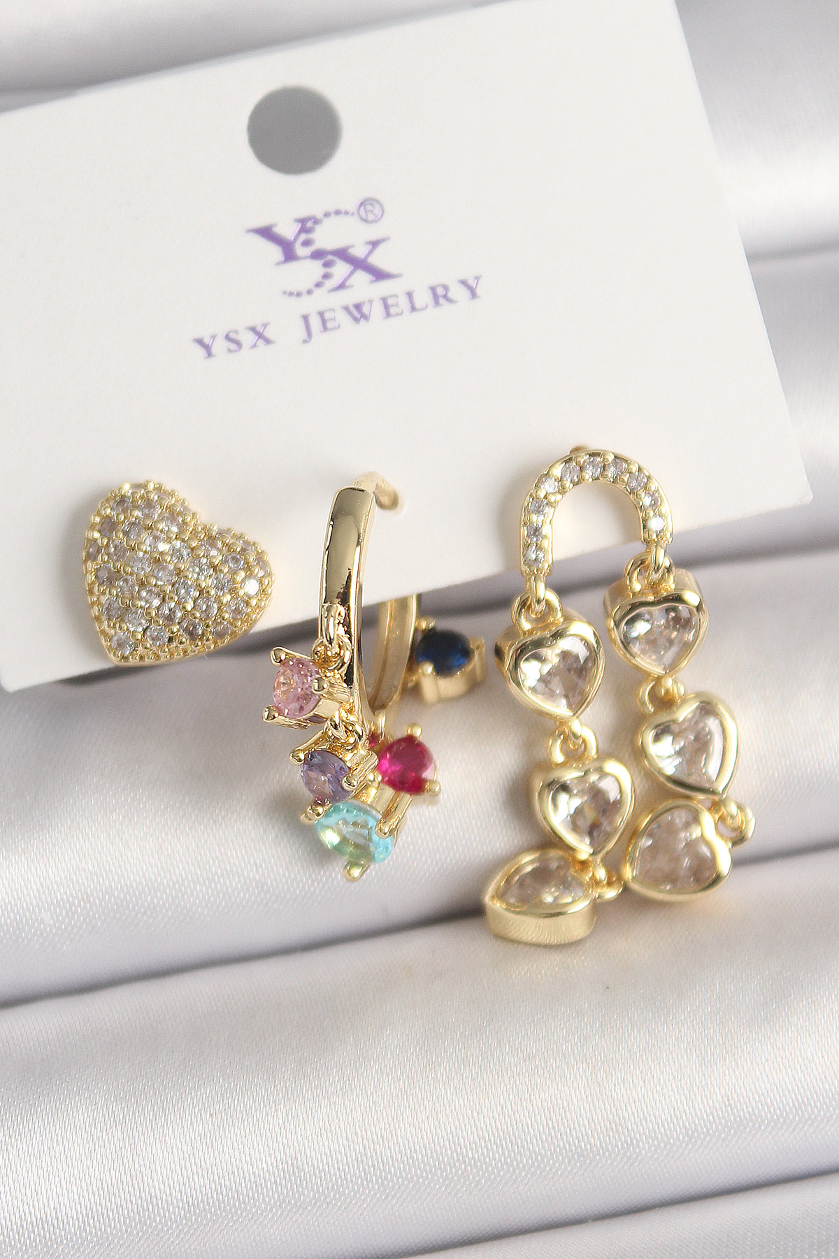 Pirinç Gold Renk Sallantı Zirkon Taşlı Kalp Model 3'Lü Kadın Kombin Küpe - TJ-BKP10469