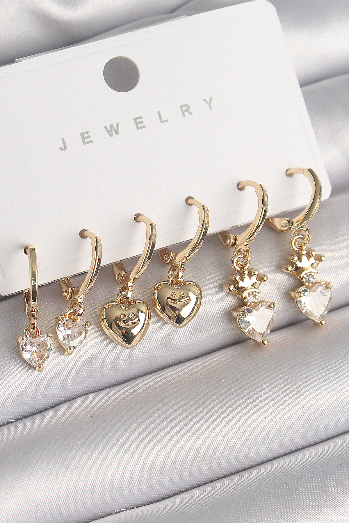 Pirinç Gold Renk Sallantı Zirkon Taşlı Kalp Model Taç Detay Kadın Küpe Seti - TJ-BKP10276