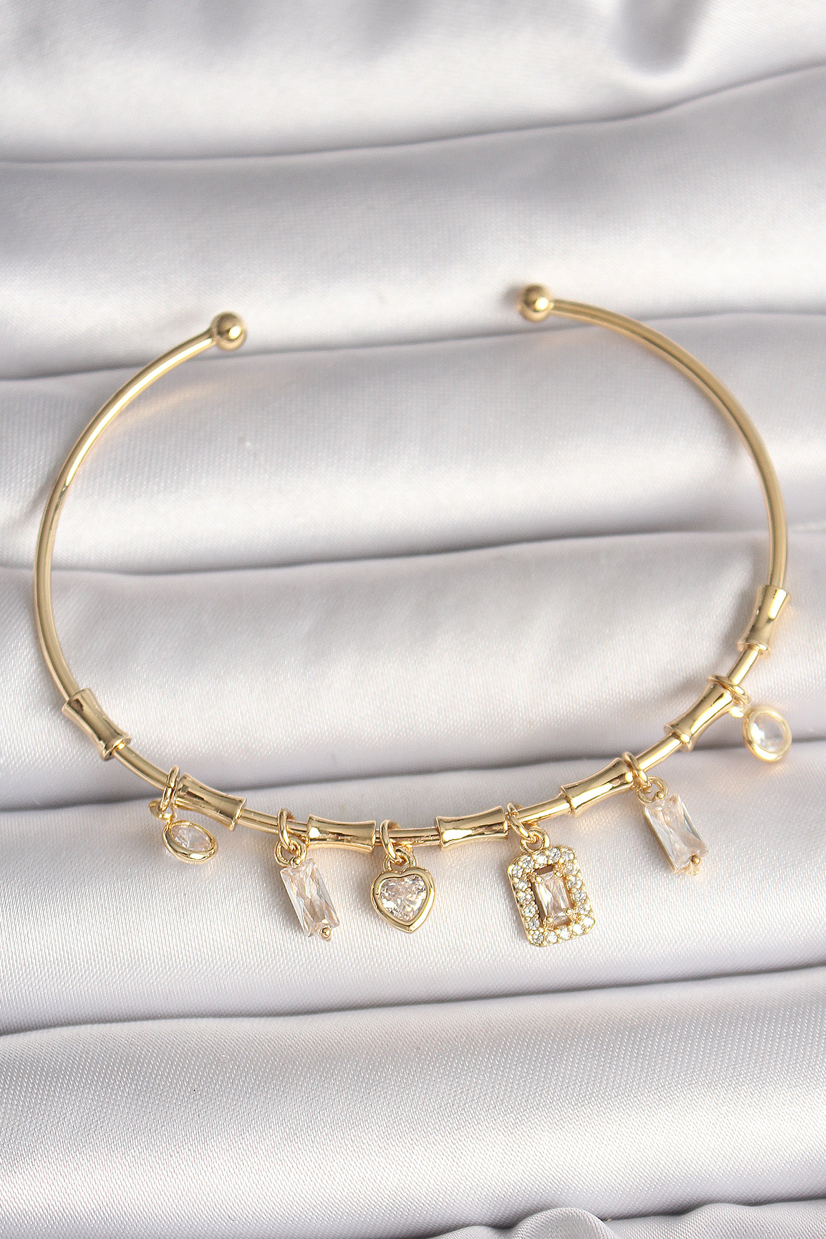 Pirinç Gold Renk Sallantı Zirkon Taşlı Kare Figür Kalp Detay Charm Kadın Bileklik - TJ-BB6895