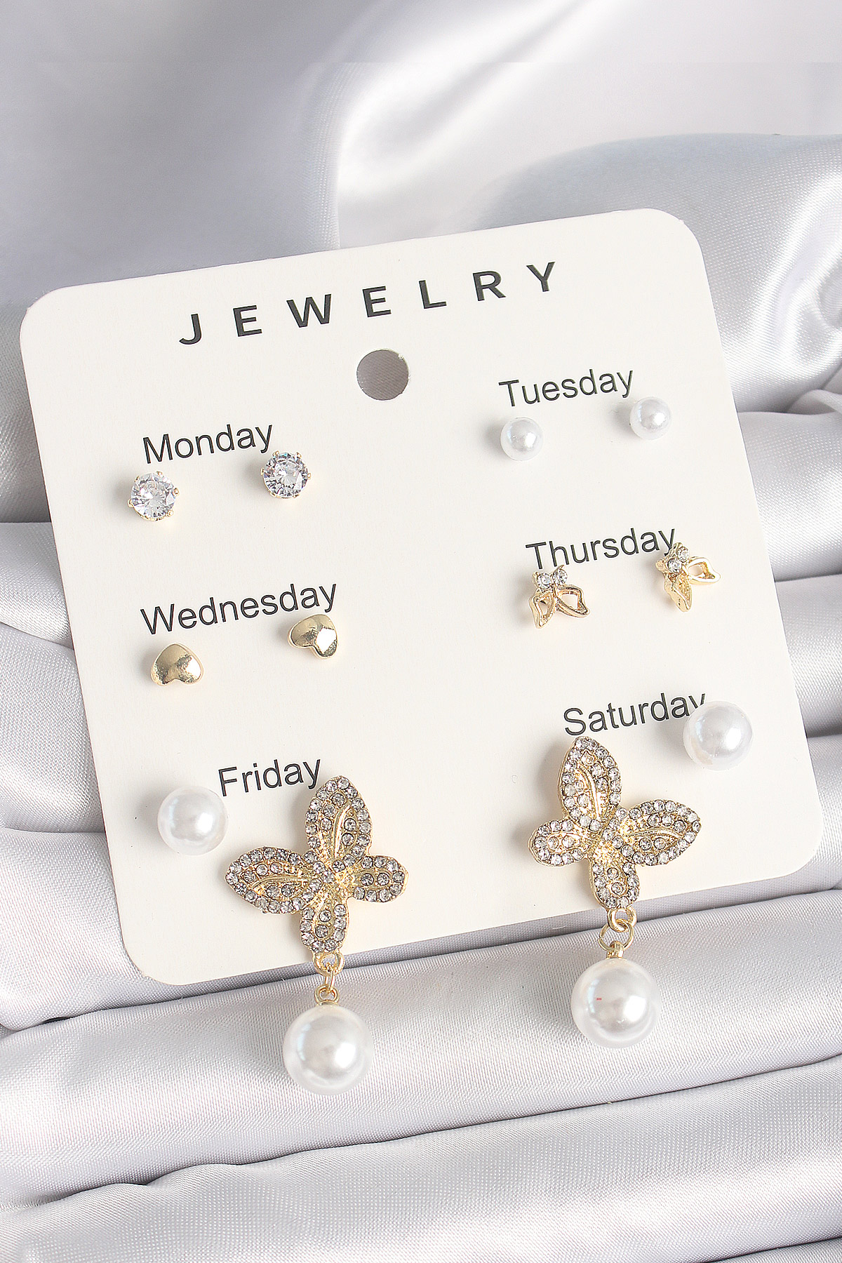 Pirinç Gold Renk Sallantı Zirkon Taşlı Kelebek Figür İnci Detay 7'Li Kadın Küpe Seti - TJ-BKP10326