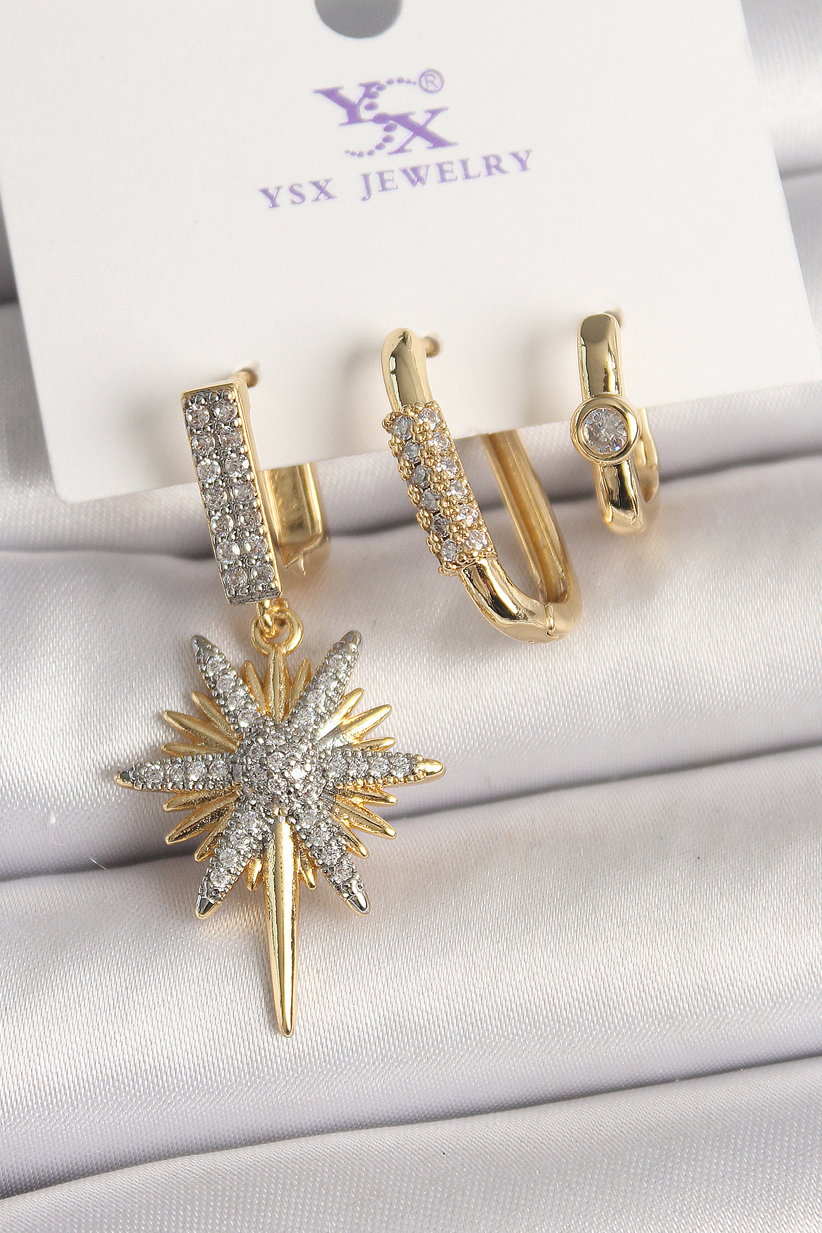 Pirinç Gold Renk Sallantı Zirkon Taşlı Kutup Yıldız Model 3'Lü Kadın Kombin Küpe - TJ-BKP10473