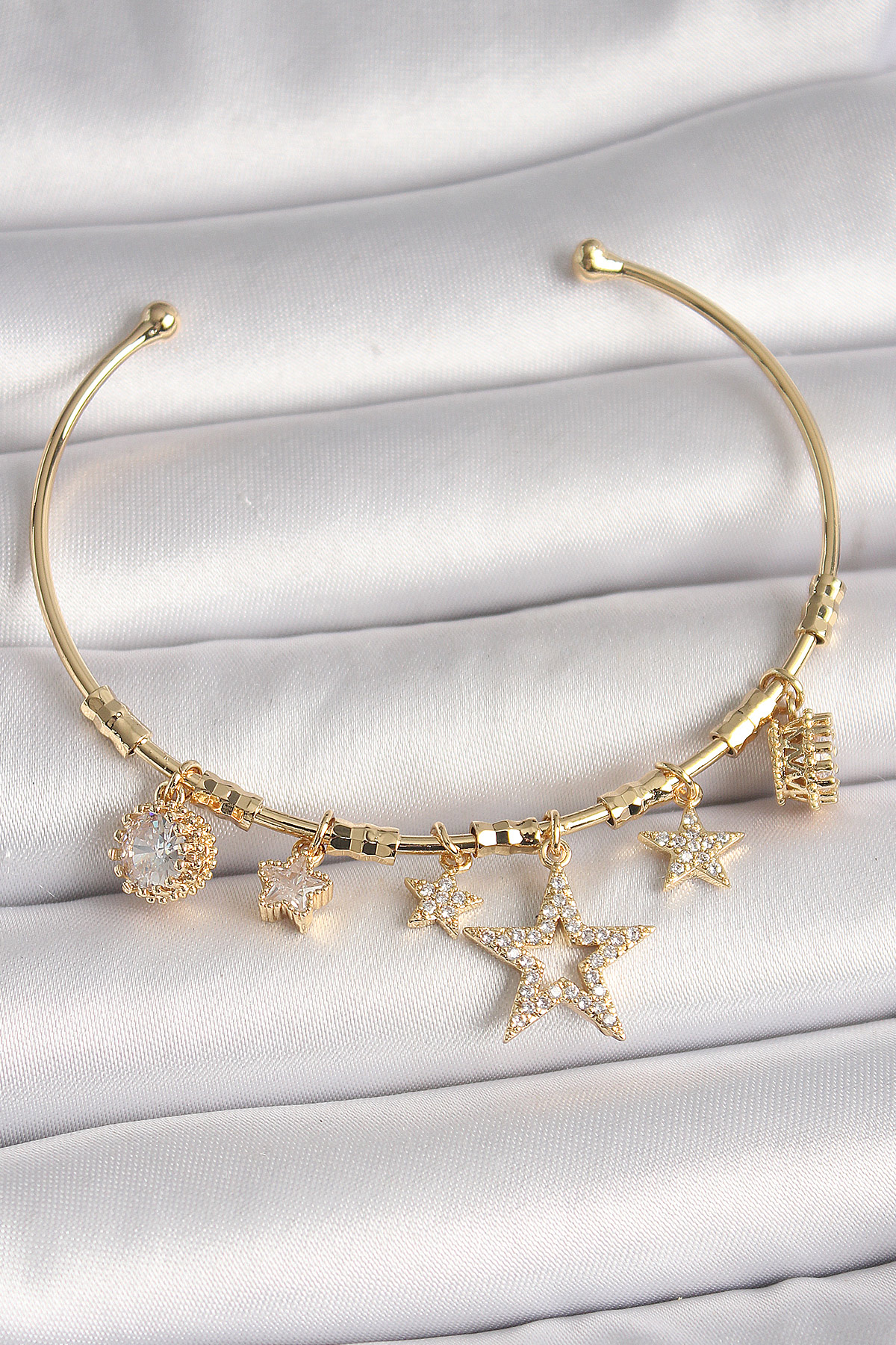 Pirinç Gold Renk Sallantı Zirkon Taşlı Yıldız Model Kalp Detay Charm Kadın Bileklik - TJ-BB6930
