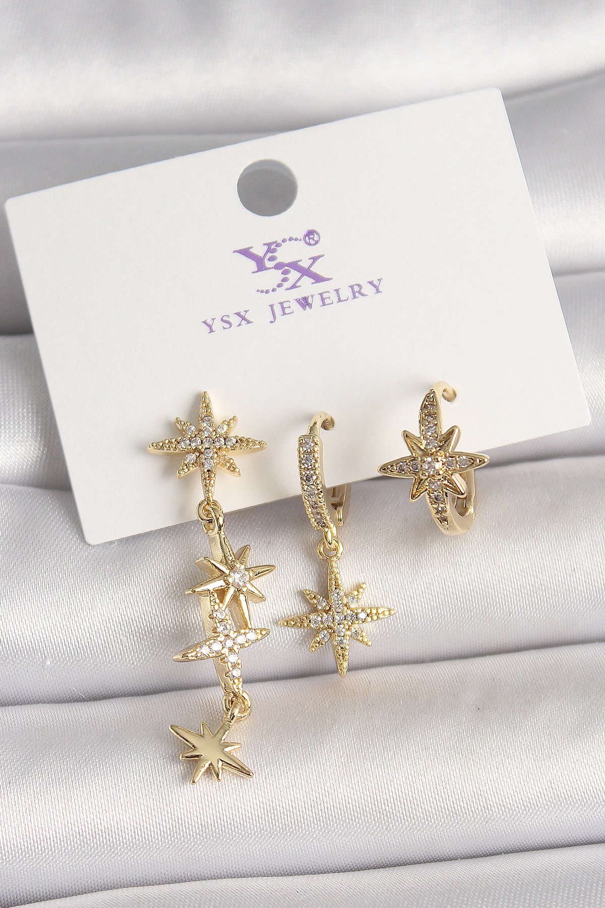 Pirinç Gold Renk Sallantı Zirkon Taşlı Zirkon Taşlı Kutup Yıldız Model 3'Lü Kadın Kombin Küpe - TJ-BKP10465