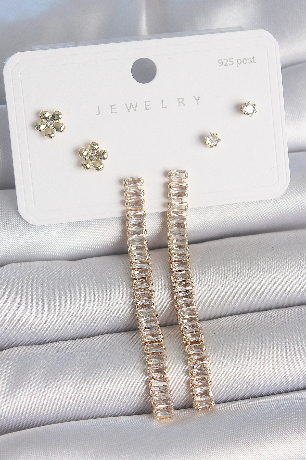 Pirinç Gold Renk Su Yolu Zirkon Taşlı Sallantı Model Çiçek Detay 925 Ayar Gümüş Çivi Kadın Küpe Seti - TJ-BKP10496
