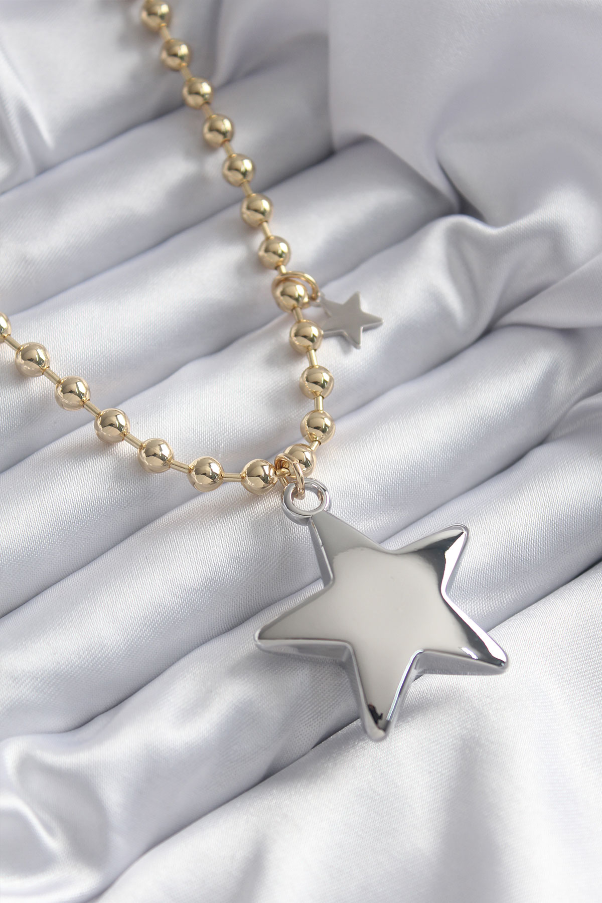 Pirinç Gold Renk Topçuk Zincir Gümüş 3D Yıldız Model Yıldız Detay VİP Kadın Kolye - TJ-BKO7887