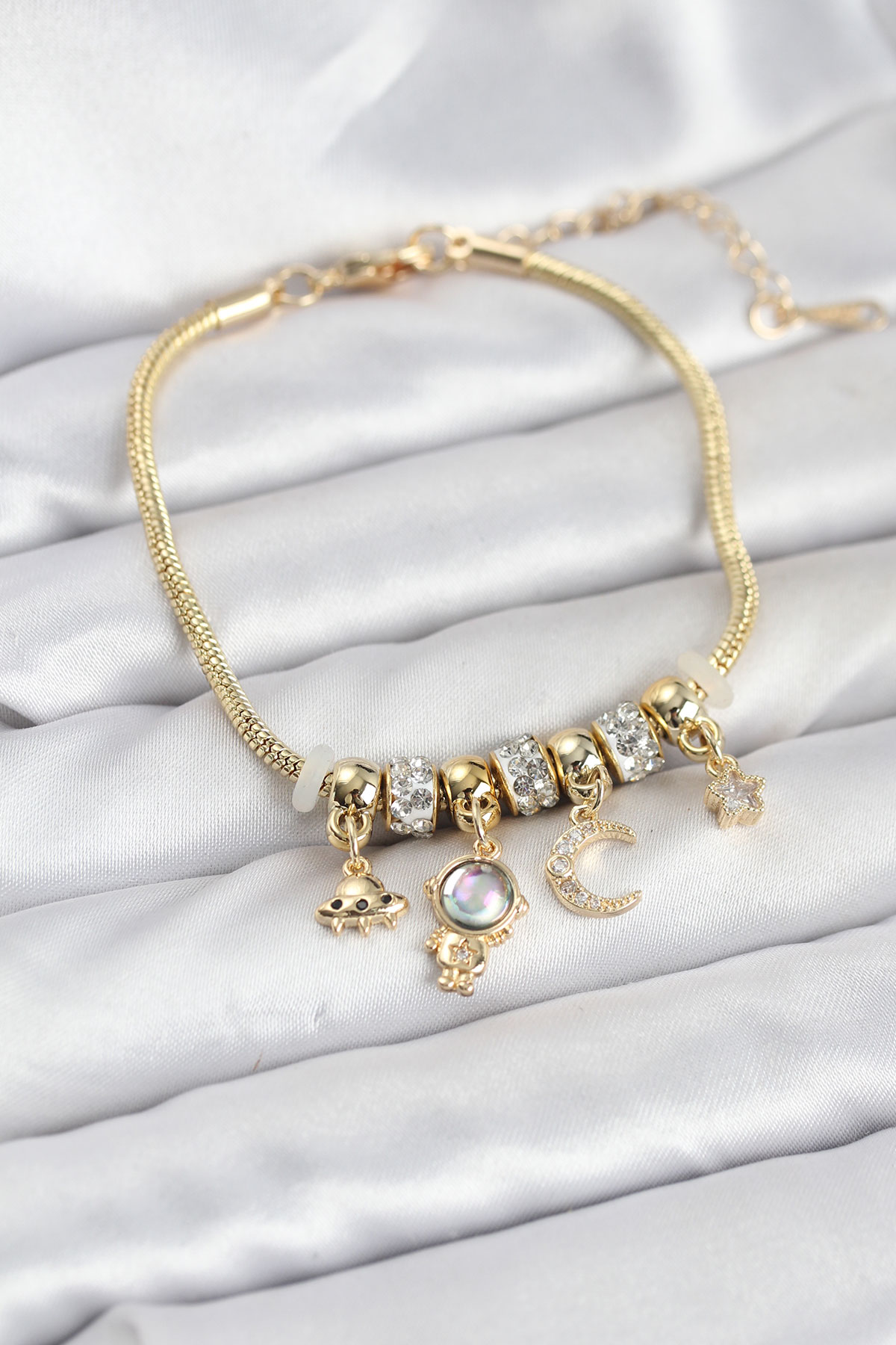 Pirinç Gold Renk Uzay Tema Charmlı Kadın Bileklik - TJ-BB8179