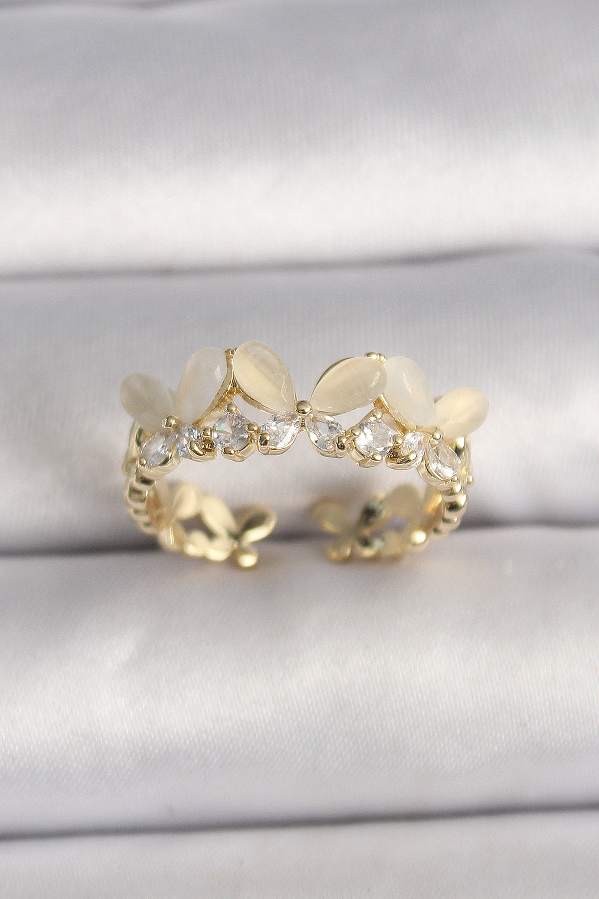 Pirinç Gold Renk Zirkon Taş Detaylı Beyaz Mineli Kelebek Model Ayarlanabilir Yüzük - TJ-BYK3529