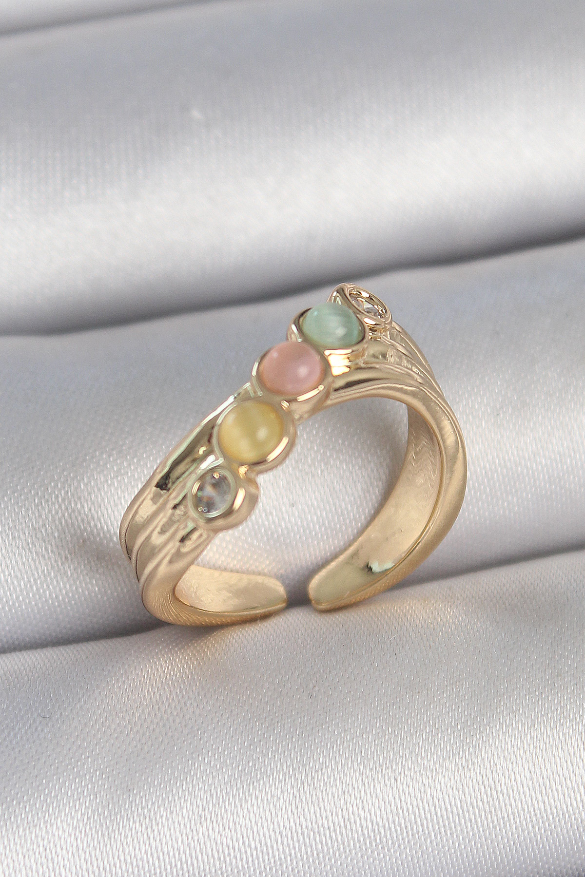 Pirinç Gold Renk Zirkon Taş Detaylı Karışık Mineli Ayarlanabilir Kadın Yüzük - TJ-BYK3729
