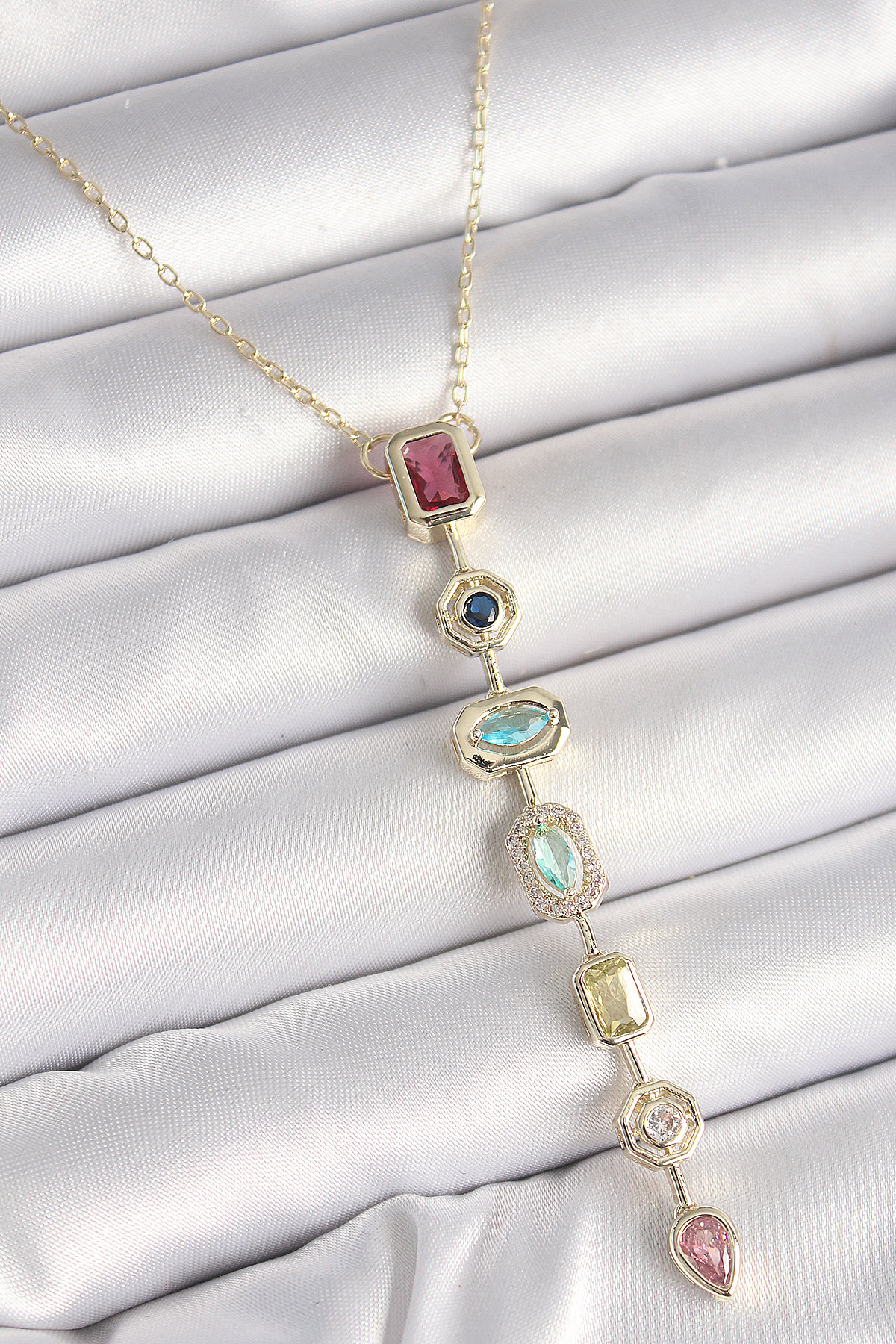 Pirinç Gold Renk Zirkon Taşlı Baget Dekolta Model Kadın Kolye - TJ-BKO9899