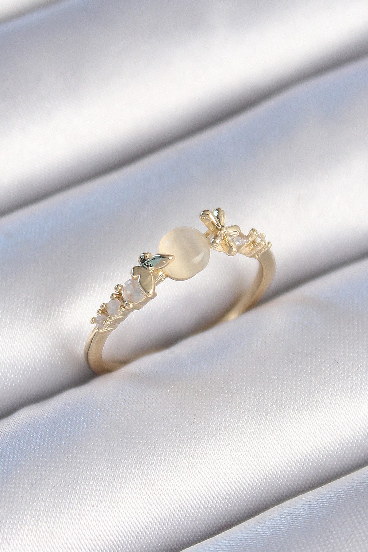 Pirinç Gold Renk Zirkon Taşlı Beyaz Mineli Kelebek Detay Kadın Yüzük - TJ-BYK3462