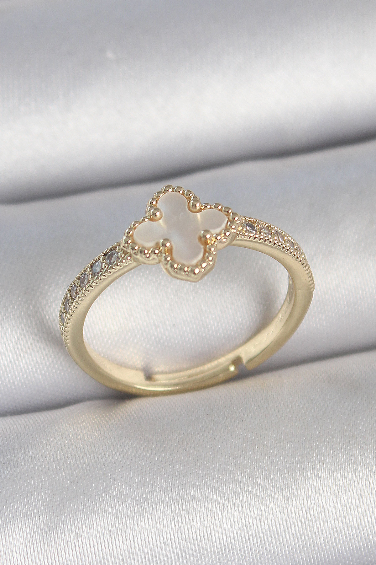 Pirinç Gold Renk Zirkon Taşlı Beyaz Mineli Yonca Model Ayarlanabilir Kadın Yüzük - TJ-BYK3737