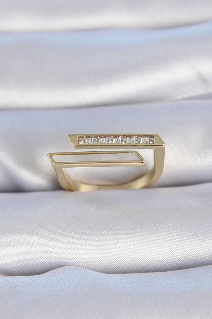 Pirinç Gold Renk Zirkon Taşlı Beyaz Sedef Detay Kadın Yüzük - BYK3348