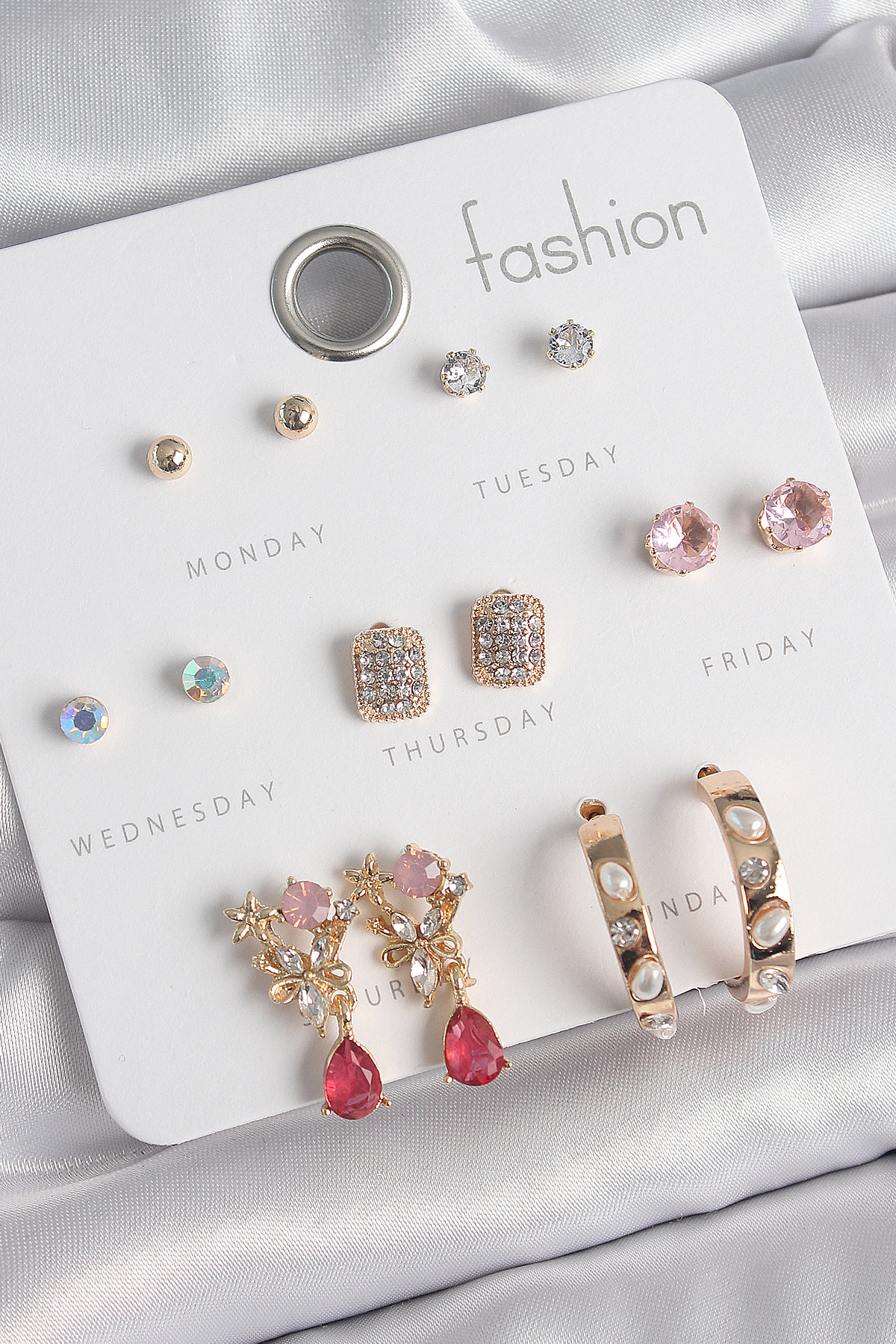 Pirinç Gold Renk Zirkon Taşlı Çiçek Figür İncili Halka Figür 7 Çift Kadın Küpe Seti - TJ-BKP10537