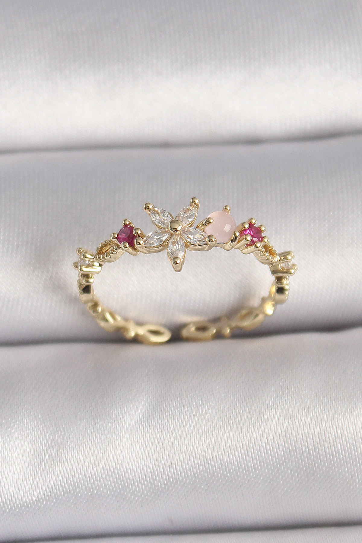 Pirinç Gold Renk Zirkon Taşlı Çiçek Model Ayarlanabilir Yüzük - TJ-BYK3563