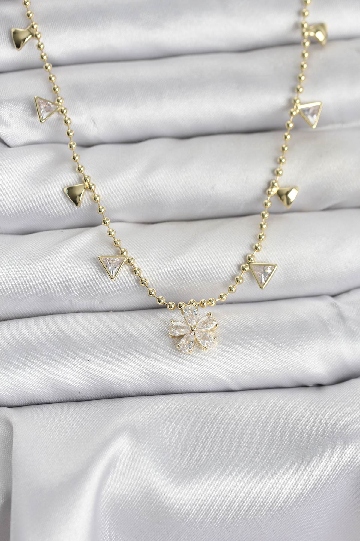 Pirinç Gold Renk Zirkon Taşlı Çiçek Model Kadın Kolye - TJ-BKO10642