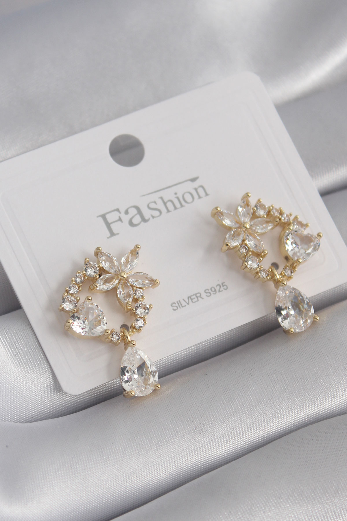 Pirinç Gold Renk Zirkon Taşlı Çiçek Model Sallantı Detay Kadın Küpe - TJ-BKP8454