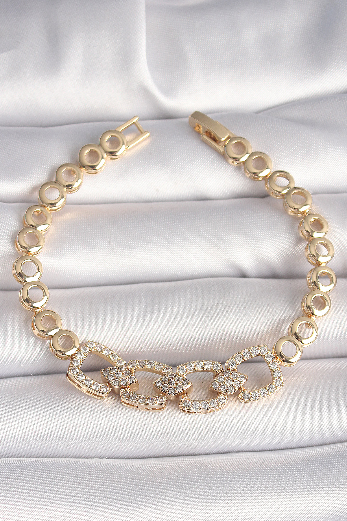 Pirinç Gold Renk Zirkon Taşlı Daire Zincir Model Kadın Bileklik - TJ-BB6842