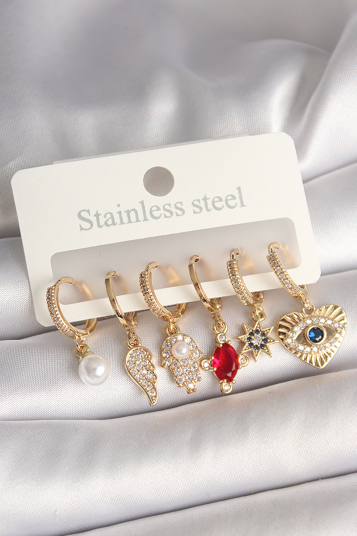 Pirinç Gold Renk Zirkon Taşlı Fatma Ana El Figür Kadın Küpe Seti - TJ-BKP10424