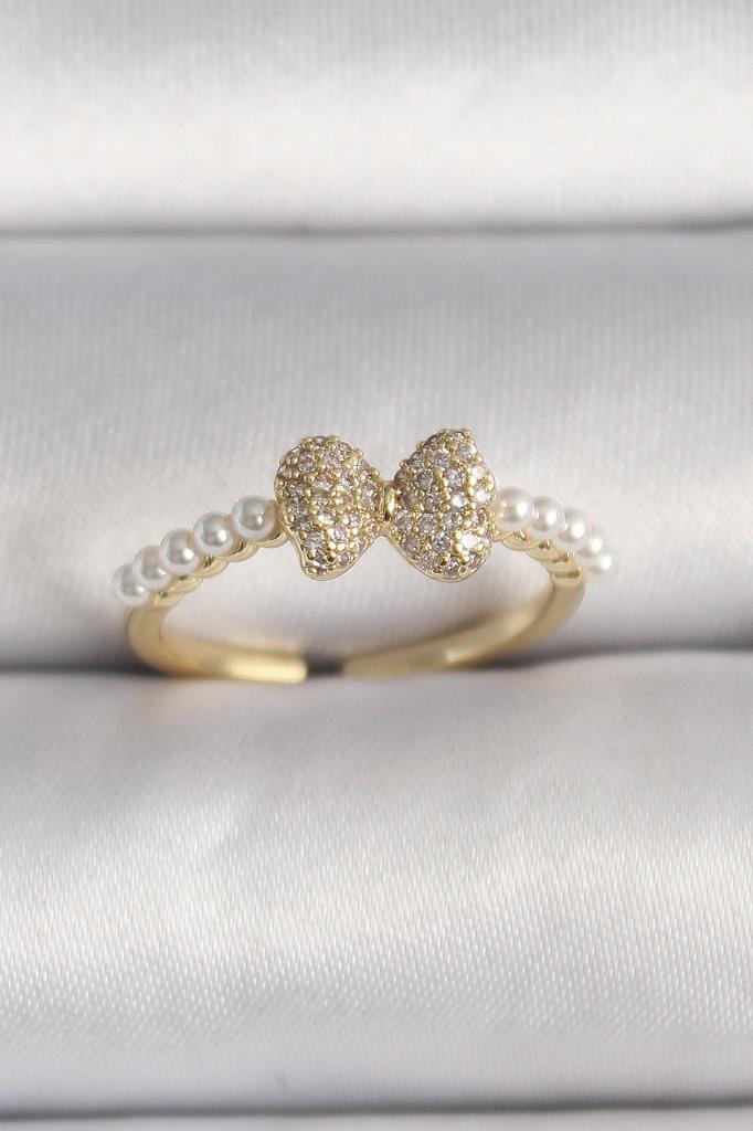 Pirinç Gold Renk Zirkon Taşlı Fiyonk İnci Detay Ayarlanabilir Yüzük - TJ-BYK3525