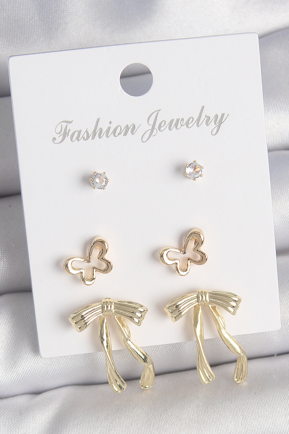 Pirinç Gold Renk Zirkon Taşlı Fiyonk Model Kelebek Detay 3 Çift Kadın Küpe Seti - TJ-BKP10615