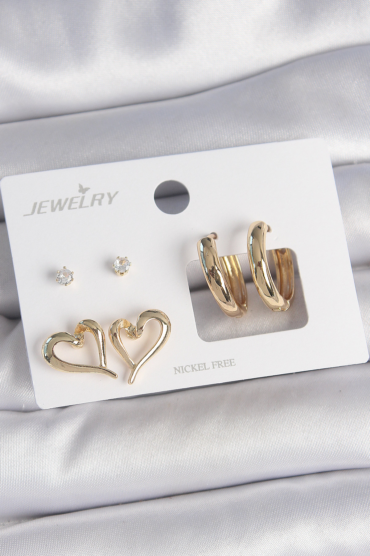 Pirinç Gold Renk Zirkon Taşlı Halka Model Kalp Detay 3 Çift Kadın Küpe Seti - TJ-BKP10622